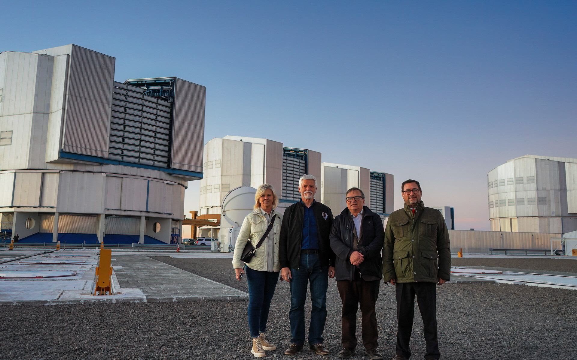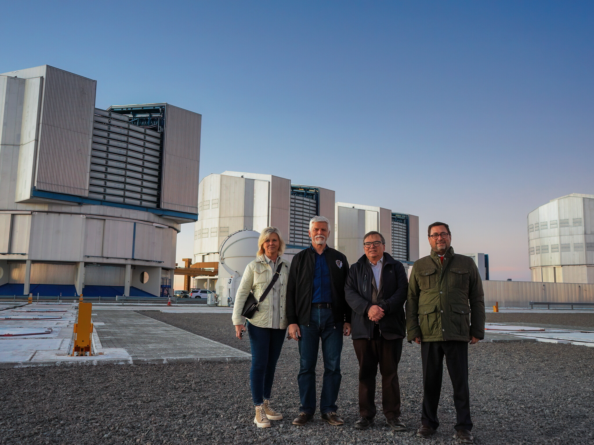 Petr Pavel, Presidente de la República Checa (centro izquierda), su esposa Eva Pavlová (izquierda), Francisco Pérez Mackenna, ministro de Relaciones Exteriores de Chile (derecha), y Xavier Barcons, director general de ESO (centro derecha), posan en el Observatorio Paranal de ESO, sede del Very Large Telescope.