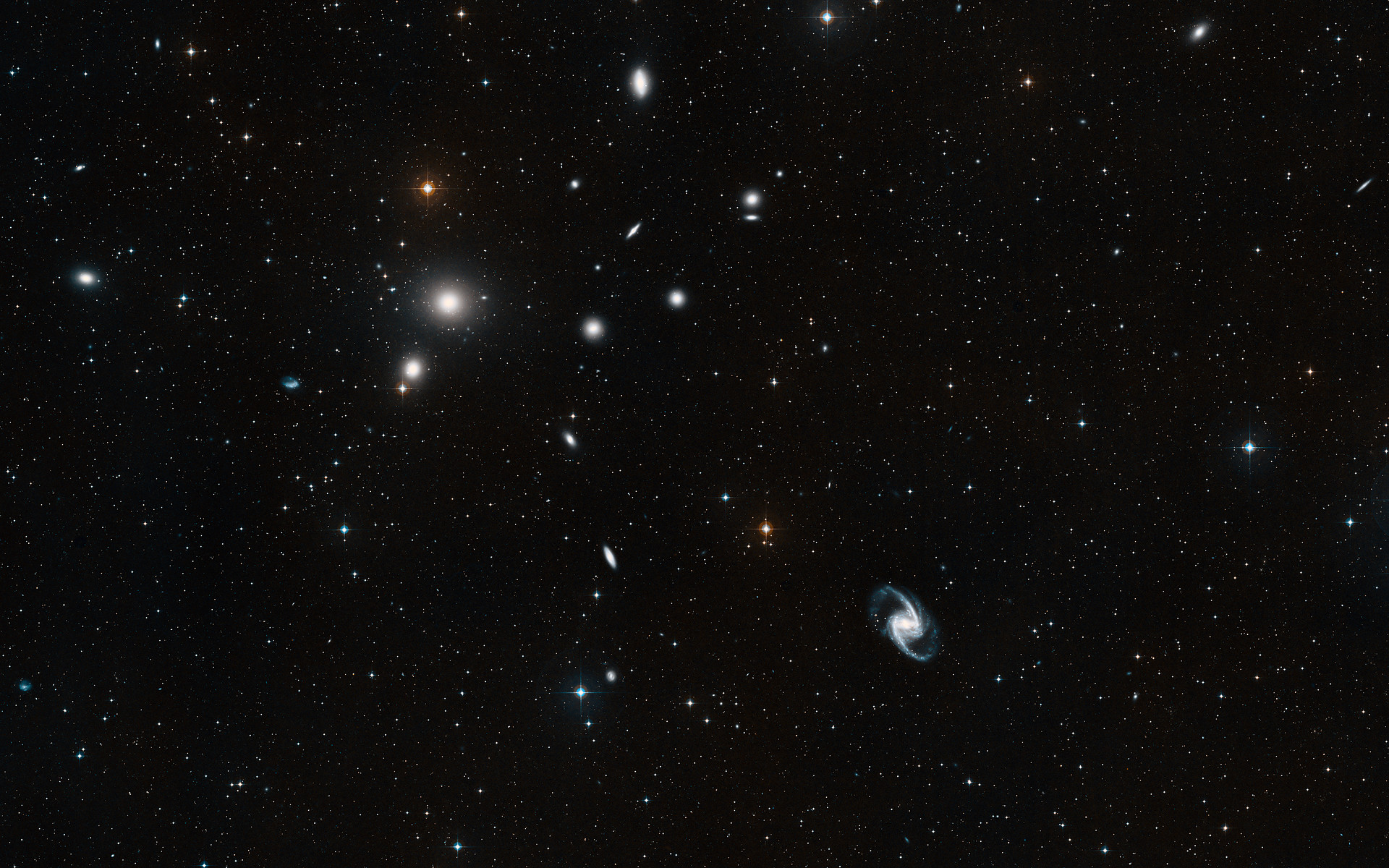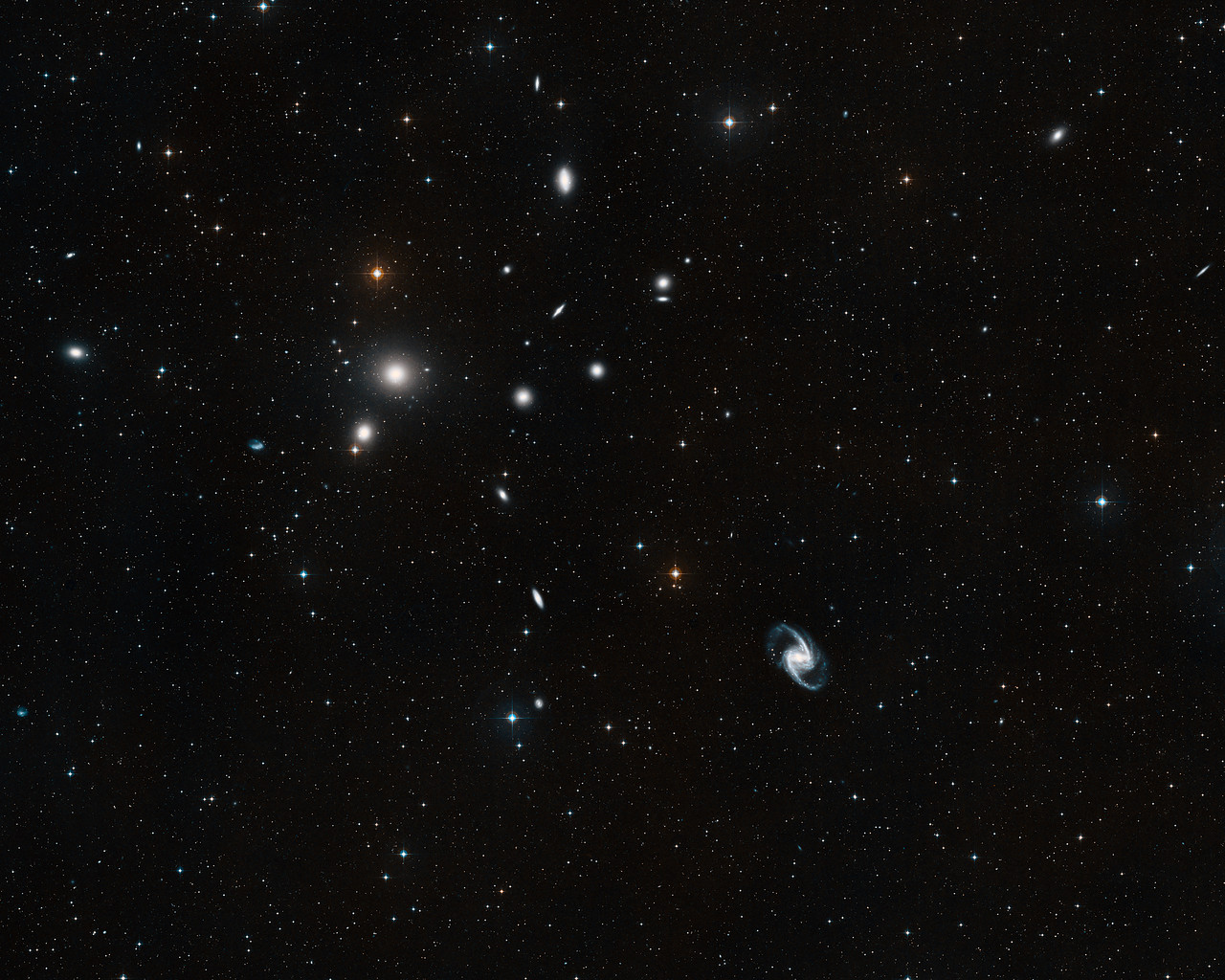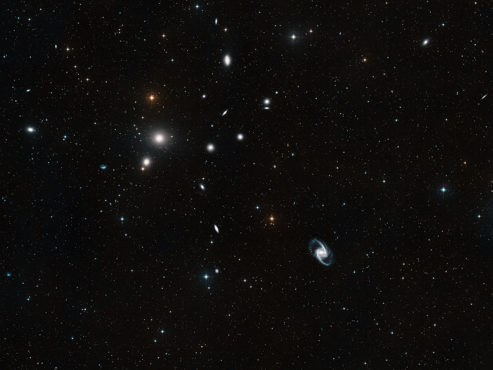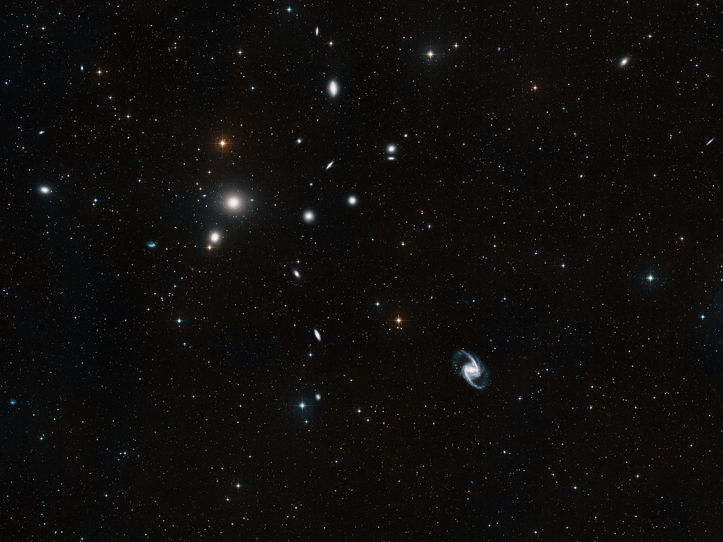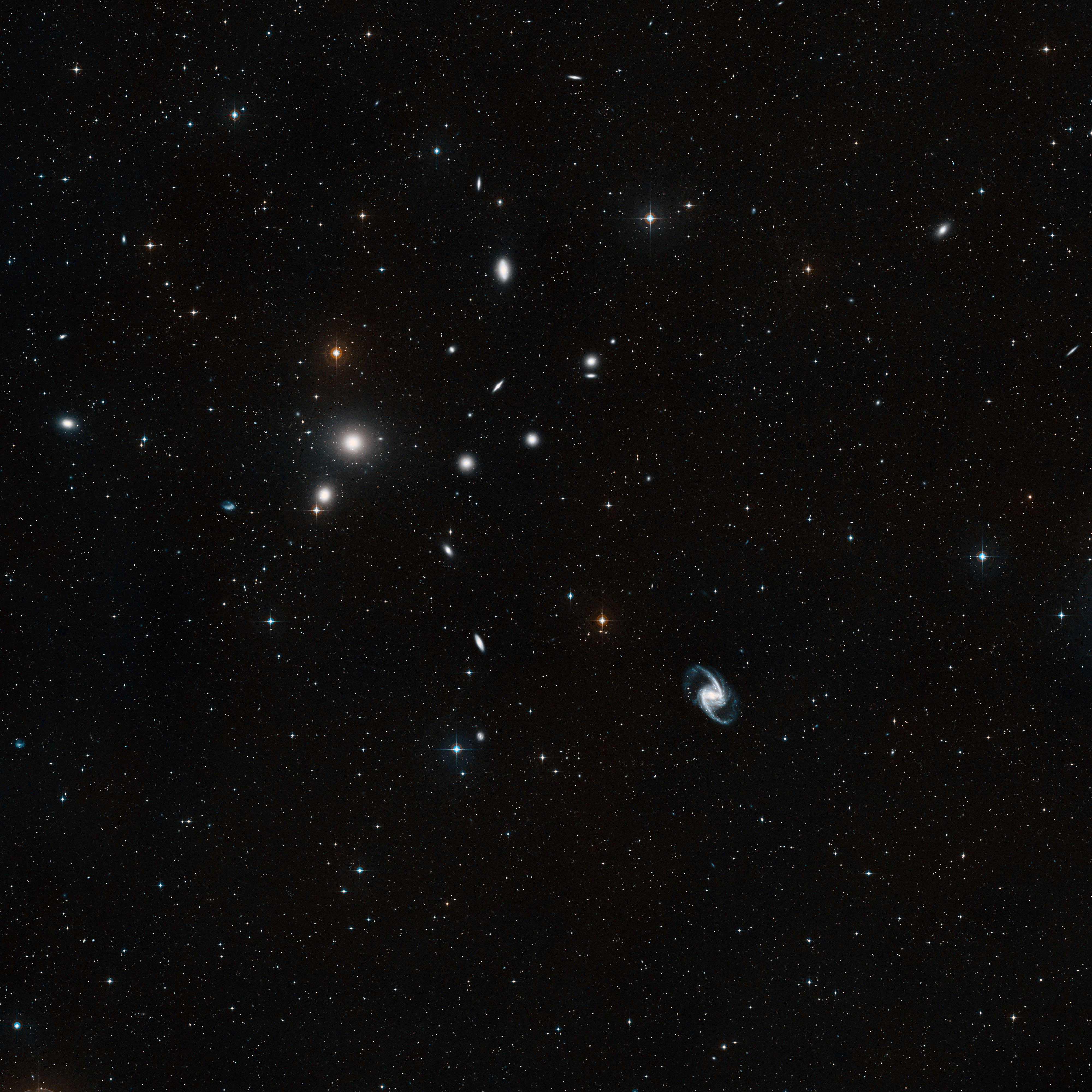 Der Fornax-Galaxienhaufen ist einer der nächsten solcher Gruppierungen jenseits unserer Lokalen Gruppe aus Galaxien. Diese Weitfeldaufnahme des Haufens im sichtbaren Licht wurde aus Fotografien erstellt, die durch rote und blaue Filter aufgenommen wurden und aus dem Digitized Sky Survey 2 stammen. Das Gesichtsfeld beträgt quer schätzungsweise 3°.