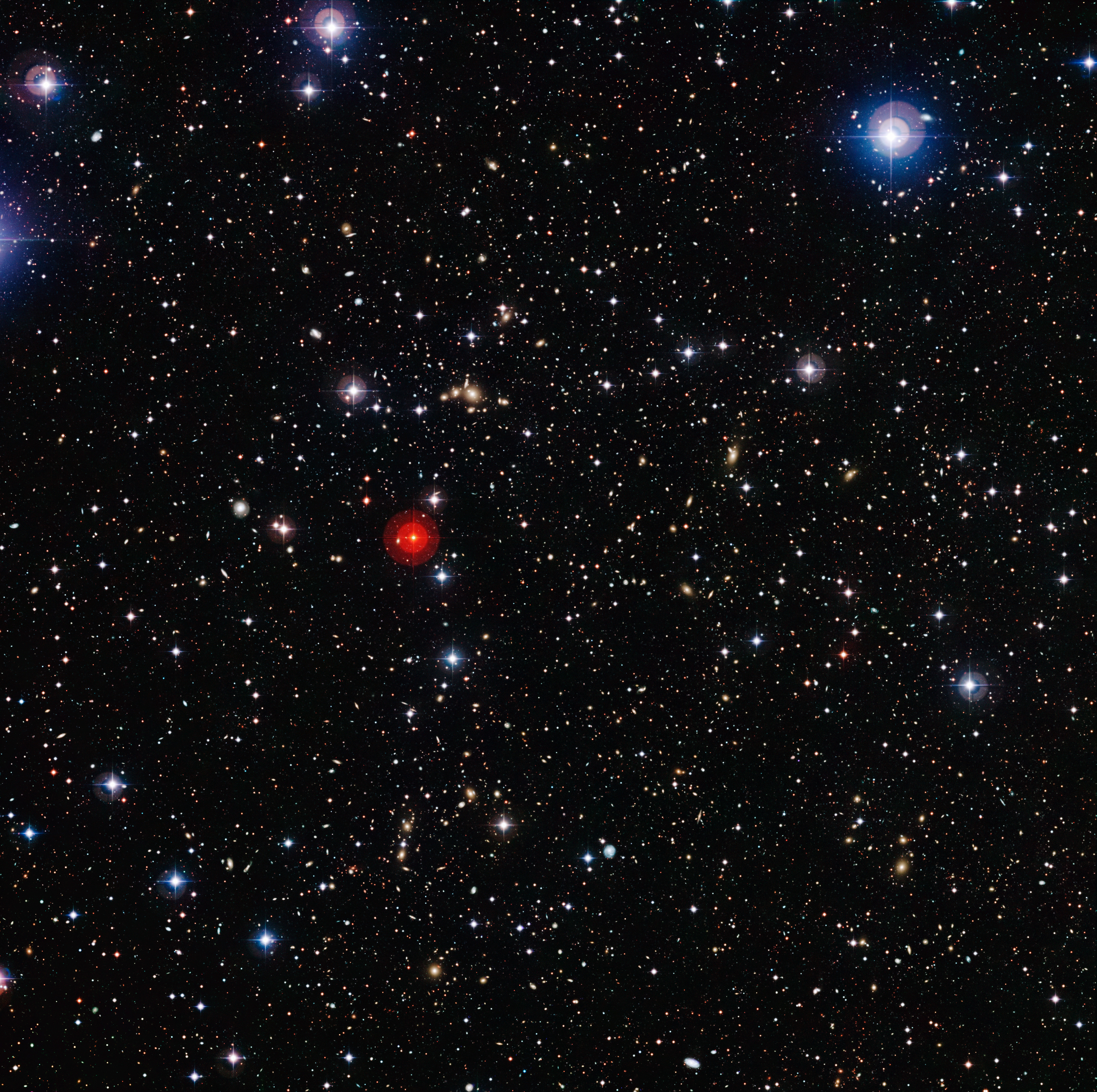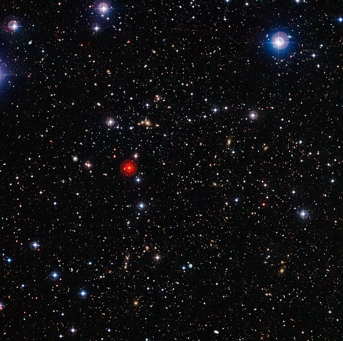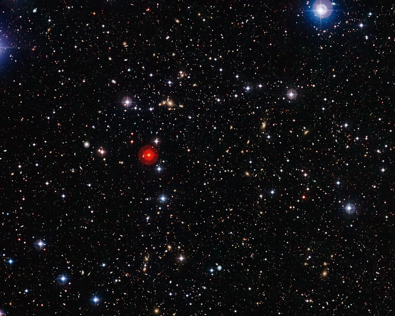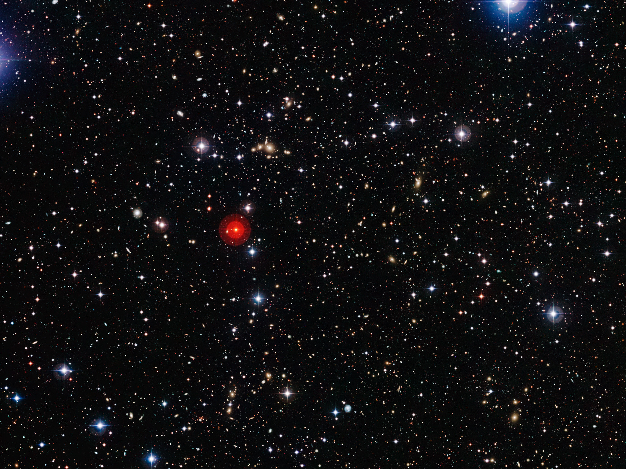Diese Deep Field-Aufnahme zeigt eine sogenannten Galaxien-Superhaufen – eine riesige Gruppe von Galaxienhaufen, die gemeinsam wiederum eine Haufenstruktur bilden. Dieser Superhaufen, bekannt unter dem Namen Abell 901/902, besteht aus drei separaten Haupthaufen und einer größeren Anzahl von Galaxien-Filamenten, die typisch für solche Superstrukturen sind. Einer der Haufen, Abell 901a, ist etwas rechts von dem hellen roten Vordergrundstern nahe der Bildmitte zu sehen. Ein weiterer, Abell 901b, liegt nochmal weiter rechts von Abell 901a und etwas tiefer. Abschließend liegt der Haufen Abell 902 gerade unterhalb des roten Sterns in Richtung der unteren Bildkante.