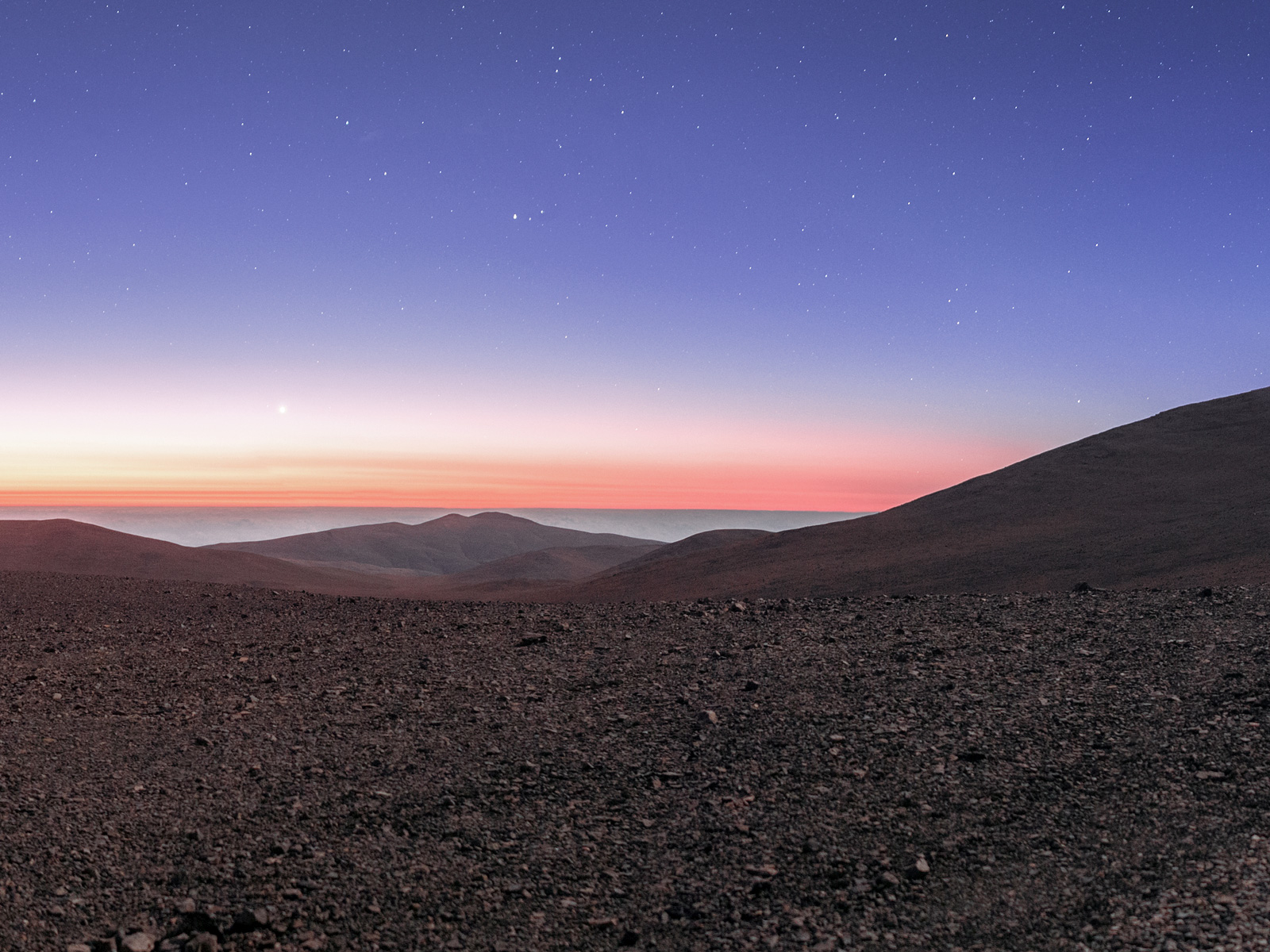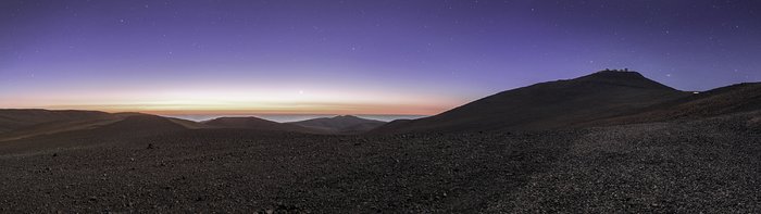 Der Planet Venus sticht genau im Zentrum des Bildes aus dem allgemeinen Violett des Himmels hervor, während das Very Large Telescope (VLT) auf dem Berg rechts zu sehen ist, dem Cerro Paranal. Die Andromeda-Galaxie erkennt man als schwachen ovalen Fleck rechts von den vier gigantischen 8,2-Meter VLT-Hauptteleskopen. Andromeda ist ein Objekt des nördlichen Sternenhimmels und befindet sich nur knapp oberhalb der Sicherheitsgrenze für die Neigung der Teleskope auf dem Paranal.