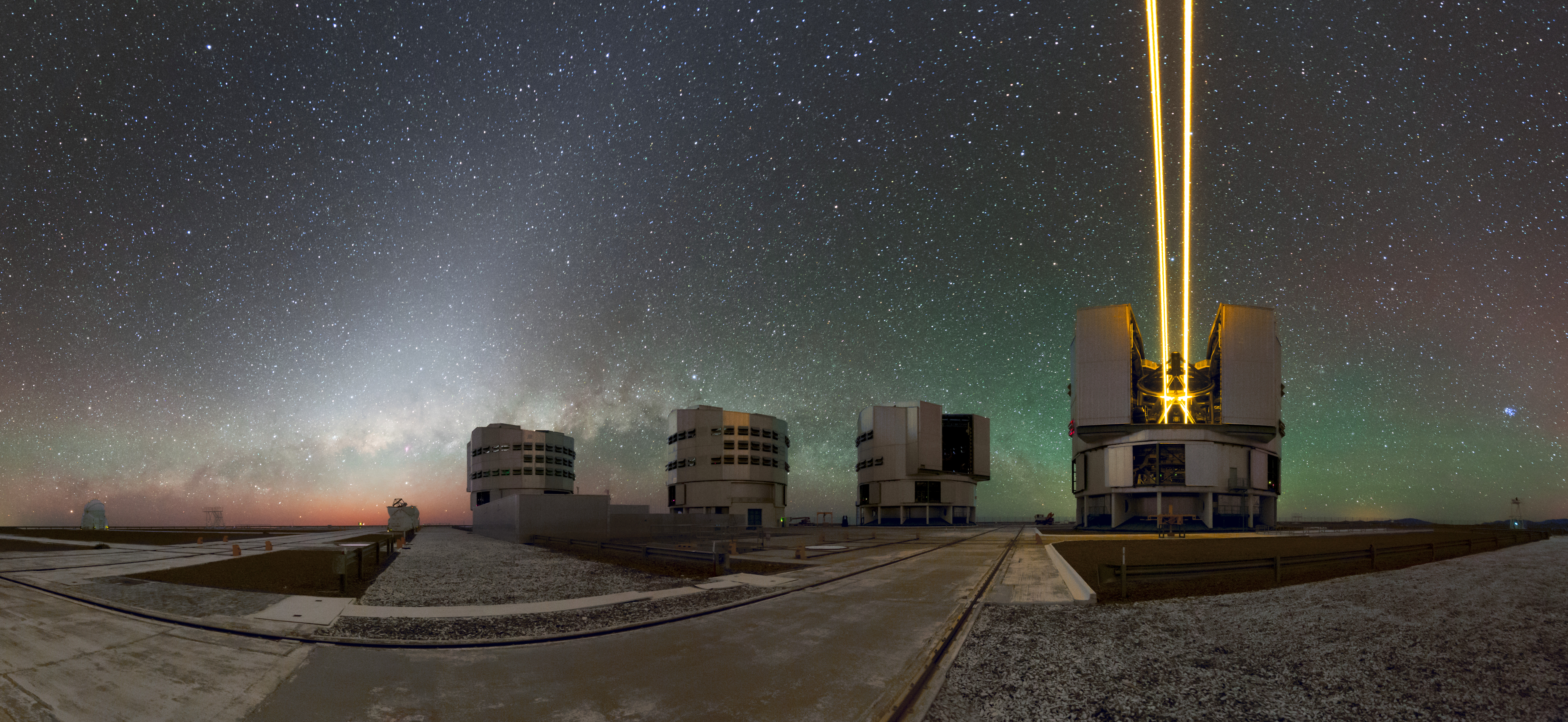 Trotz seines Namens ist das Very Large Telescope (VLT) der ESO kein Einzelteleskop. Es besteht eigentlich aus vier separaten Hauptteleskopen mit 8,2 Metern Durchmesser – den größten hier sichtbaren Gebäuden – und vier verfahrbaren Hilfsteleskopen mit 1,8 Metern Durchmesser, von denen man zwei ganz links im Hintergrund sieht.