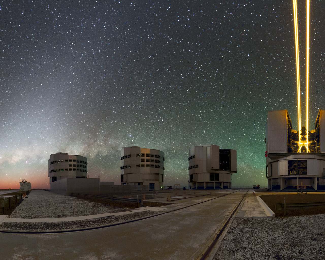 Das Hauptteleskop 4 ist mit Laser-Leitsternen ausgerüstet, die in den Himmel strahlen und dort in der Hochatmosphäre in etwa 90 Kilometern Höhe künstliche Leitsterne projizieren. Diese hellen Laserstrahlen reichen bis hoch in die Mesosphäre, wo sie dann Natriumatome anregen und zur Aussendung von Photonen bringen, was dann einen künstlichen hellen Leitstern erzeugt, den man für die adaptive Optik einsetzen kann.