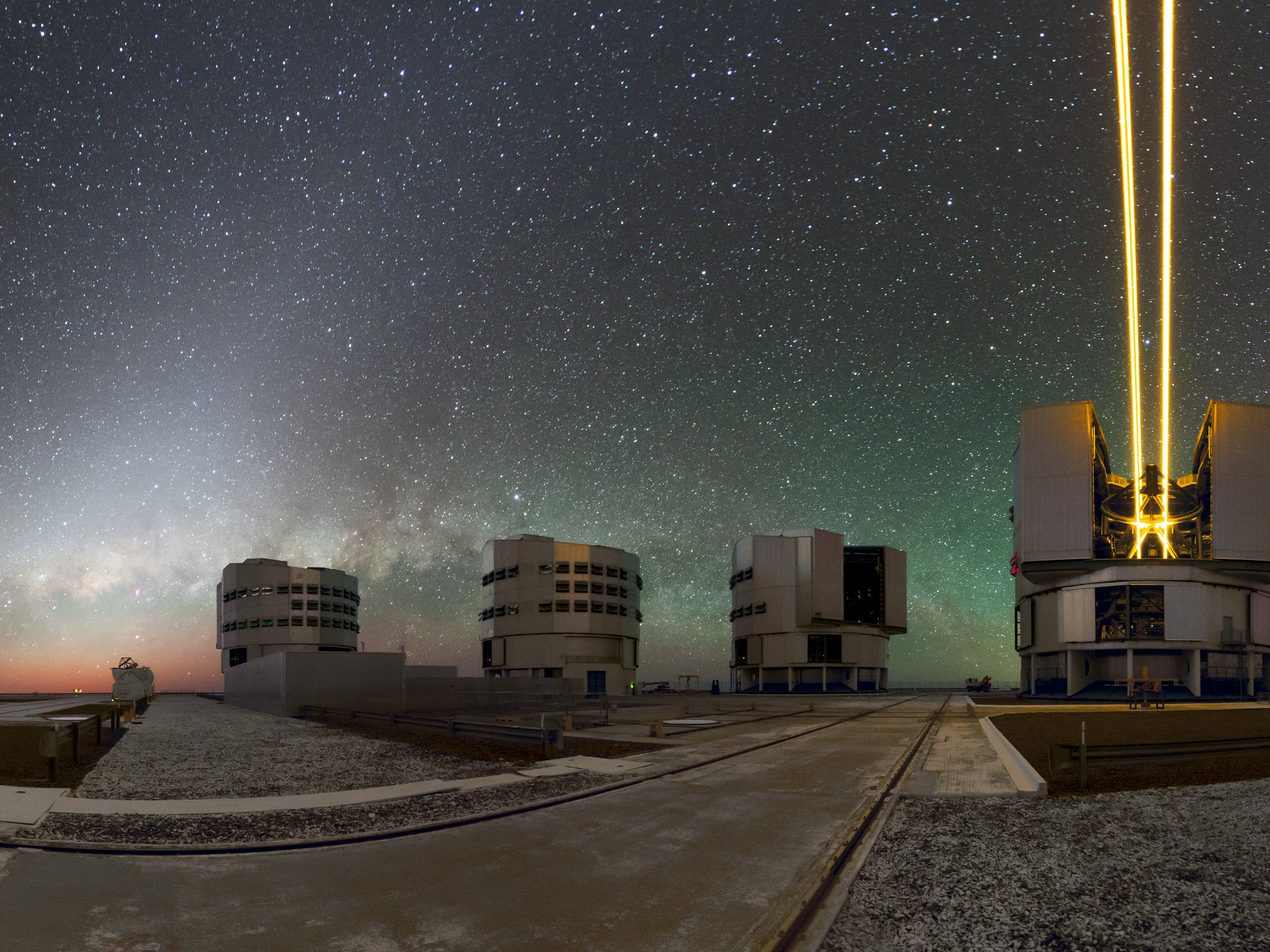 Durch seinen Aufstellungsort auf einer Bergkuppe inmitten der abgelegenen Atacama-Wüste unterliegt das VLT fast keiner Lichtverschmutzung. Doch auch dieser einzigartige Himmel ist nicht vollständig dunkel. Auf dem Bild erkennt man sehr gut den verschwommenen Schein des Sonnenlichts, das am interplanetaren Staub gestreut wird – dem Zodiakallicht – und das schwache Leuchten der Atmosphäre – dem Airglow – den man nur in den dunkelsten Nächten beobachten kann.