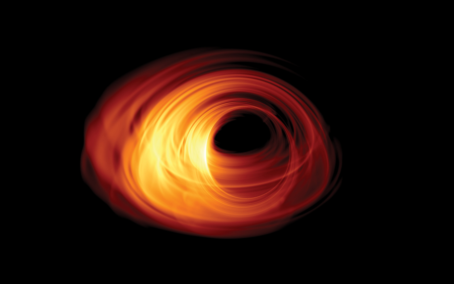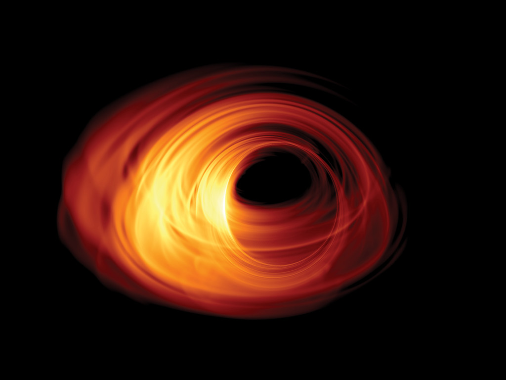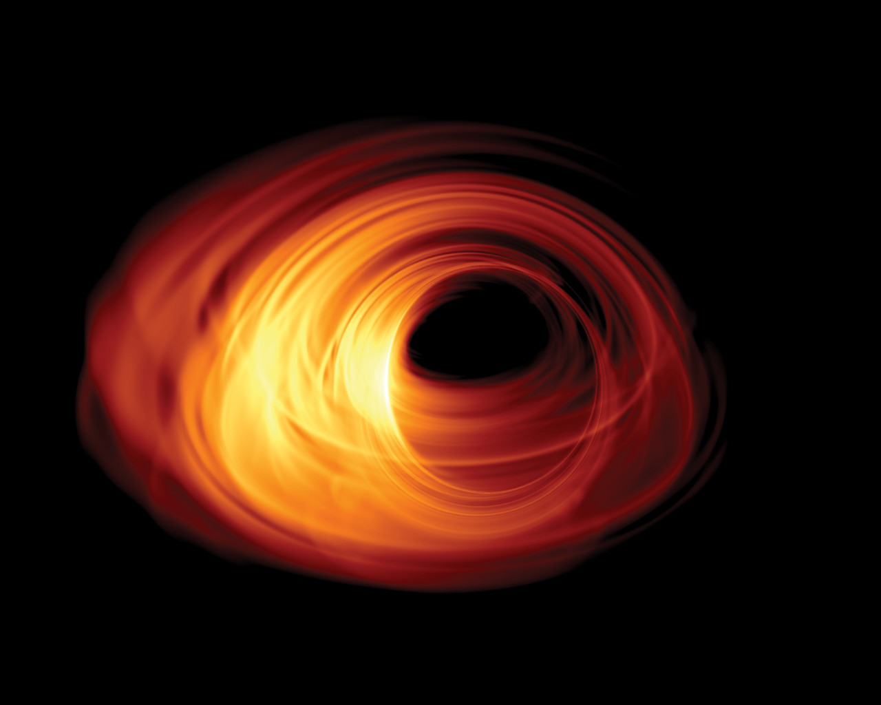 Simuliertes Bild eines akkretierenden schwarzen Lochs. Der Ereignishorizont befindet sich in der Mitte des Bildes. Der Schatten wird durch eine rotierende Akkretionsscheibe sichtbar.