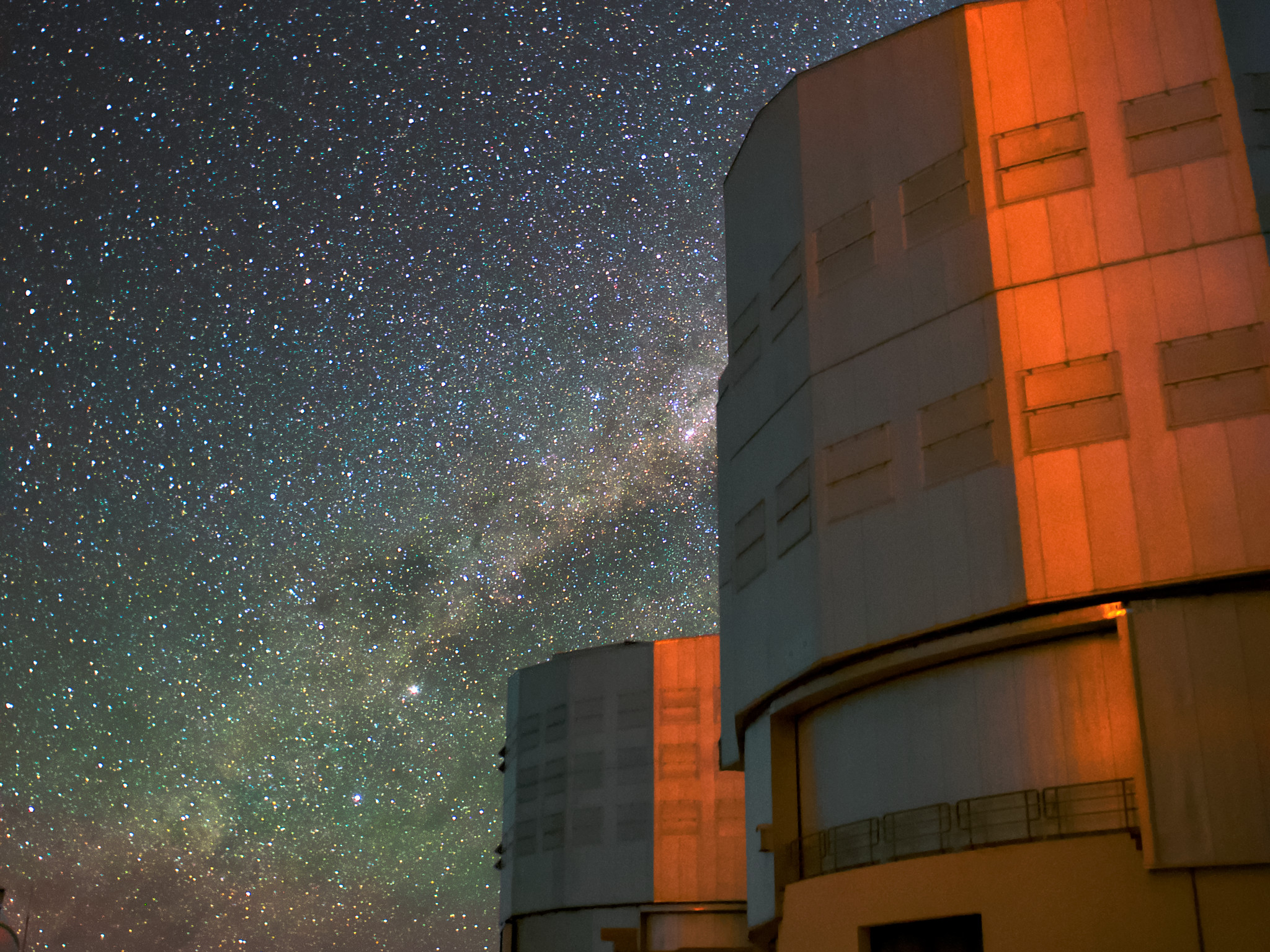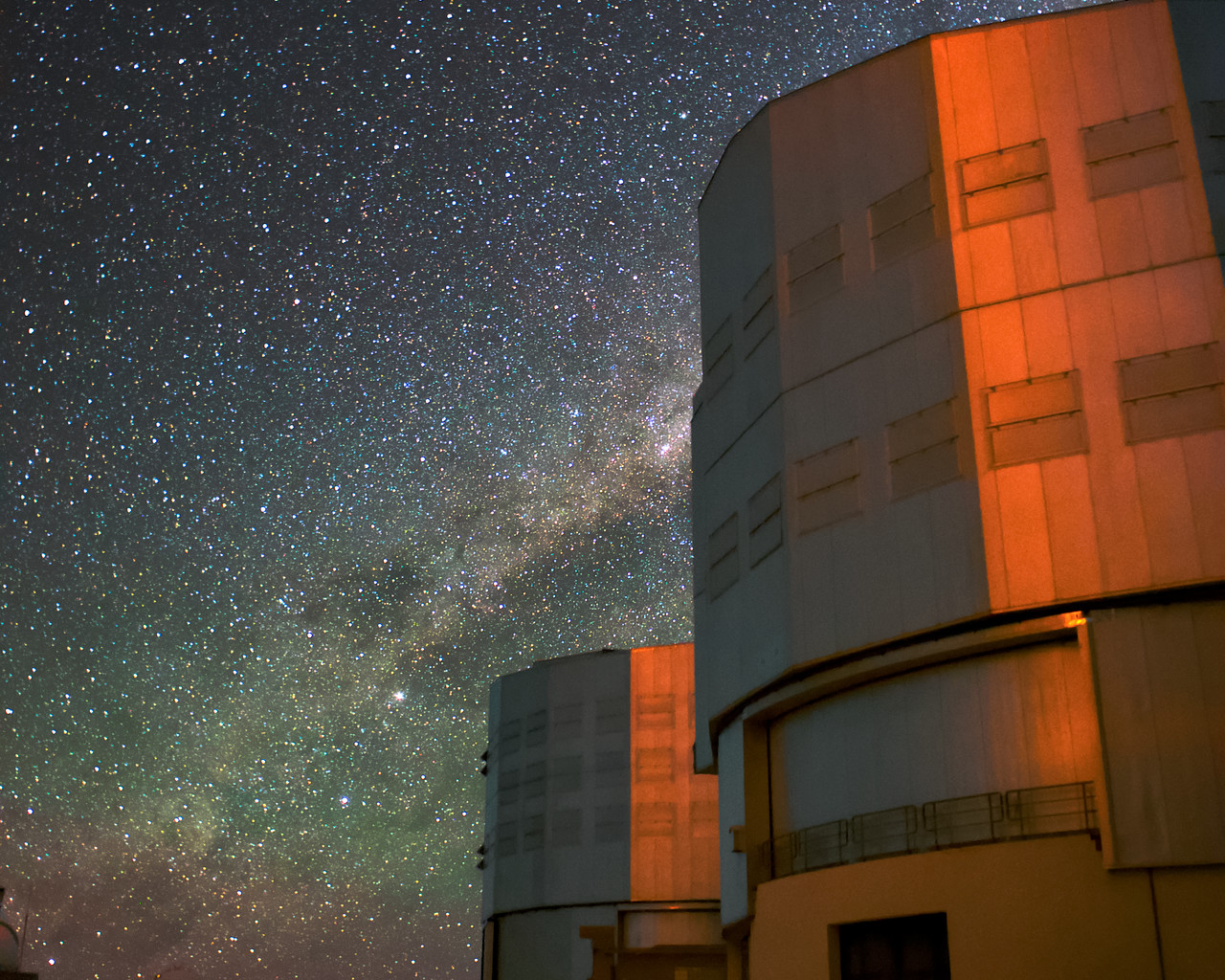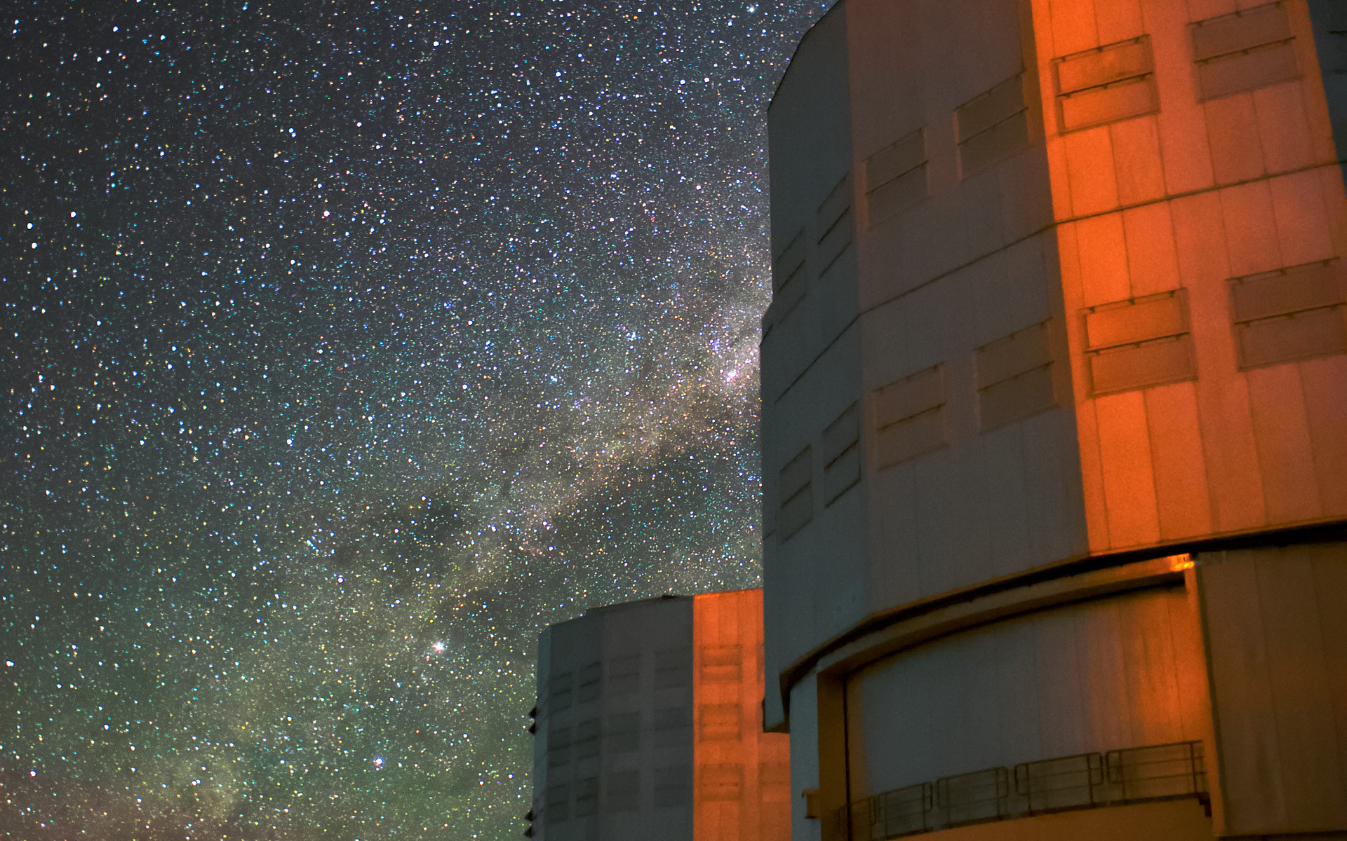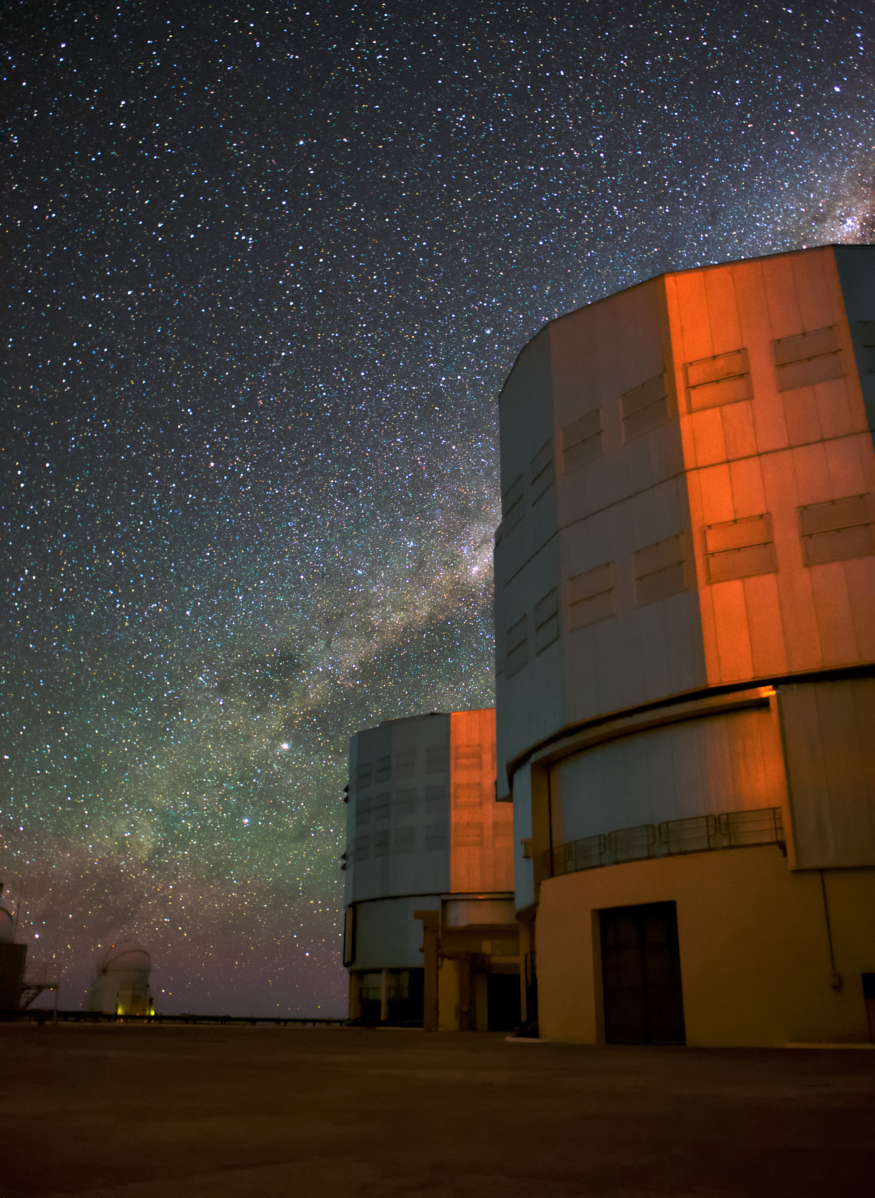 This image shows two VLT Unit Telescopes illuminated by a red glow from the (unseen) laser guide stars used in the telescope's adaptive optics system. Above them is spread the incredibly dark and clear skies of the VLT's home, the Atacama Desert. Visible crossing the star field is the plane of our galaxy, the Milky Way.