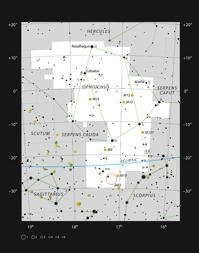 Ce graphique montre l'emplacement de Barnard 59 dans la constellation d'Ophiuchus. Cette carte montre la plupart des étoiles visibles à l'œil nu dans de bonnes conditions et Barnard 59 est indiqué par un cercle rouge sur l'image. Cette nébuleuse sombre fait partie de la nébuleuse de la Pipe, qui apparaît comme une structure sombre dans la Voie Lactée et elle peut être bien vue à l'œil nu, dans de bonnes conditions.