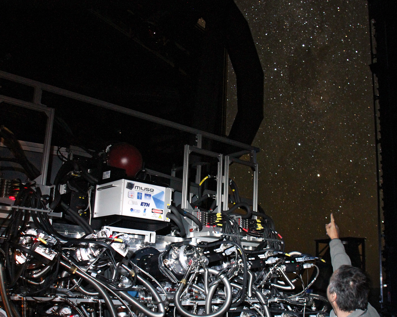 Cette photographie nocturne est spectaculaire : elle montre l'instrument MUSE à l'intérieur du dôme de la quatrième Unité Télescopique du VLT. Le tube du télescope figure dans la partie supérieure de l'image et MUSE scintille au premier plan. La Voie Lactée apparaît au travers de l'ouverture du dôme.