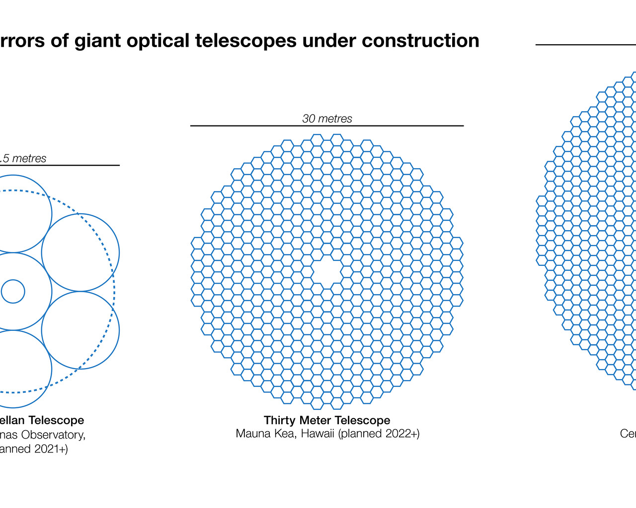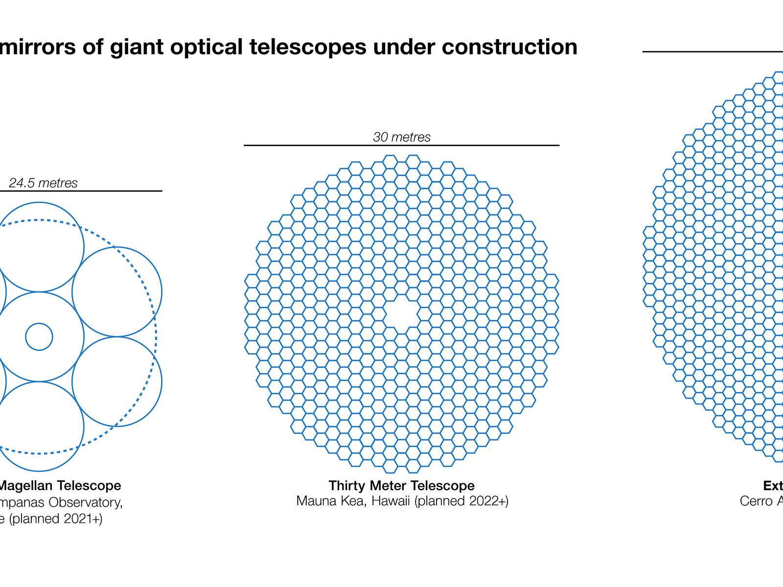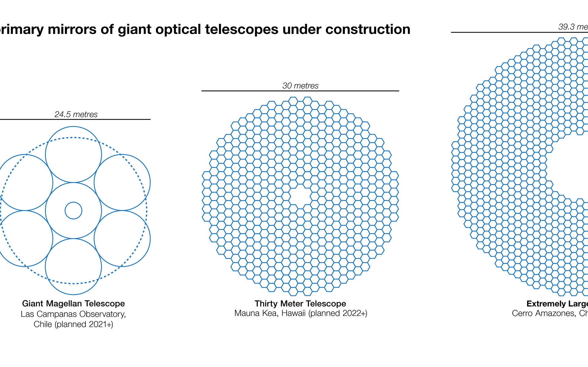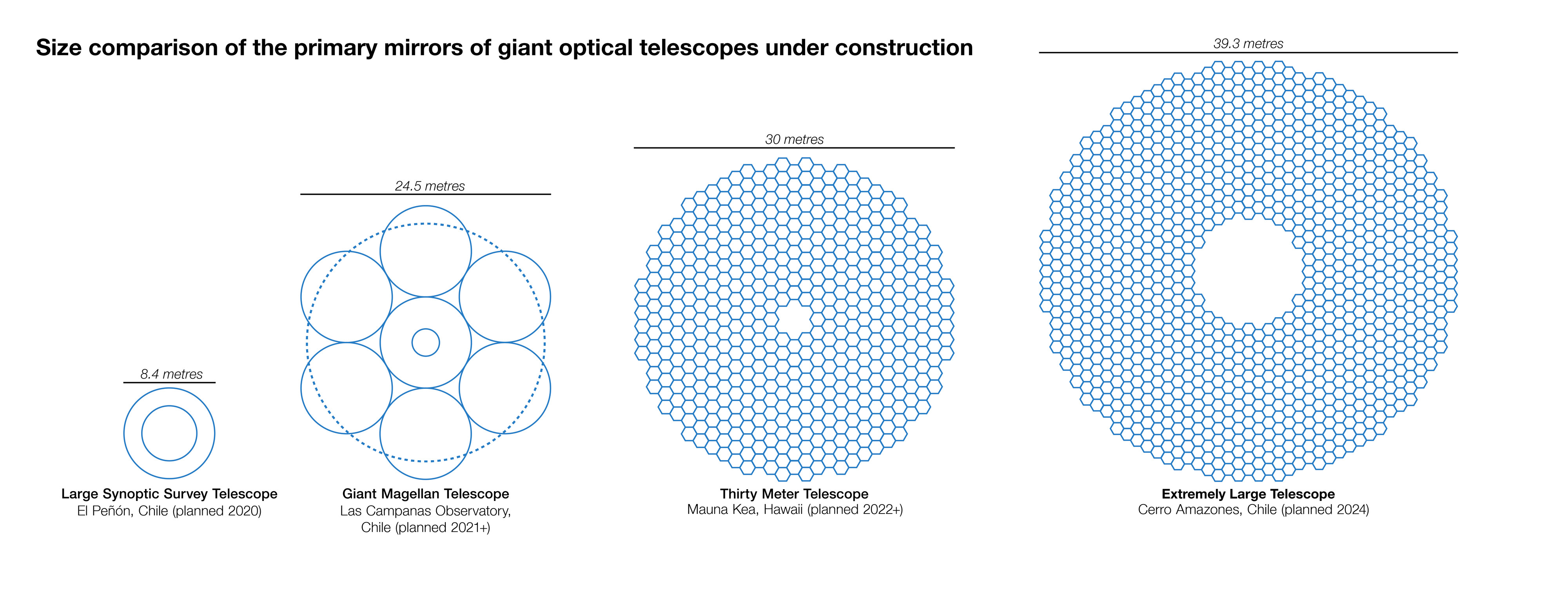 Ce graphe offre un comparatif entre les dimensions du miroir principal de l’Extremely Large Telescope (ELT) et celles des miroirs équipant les principaux télescopes au sol, actuellement en service ou en cours de construction. Doté d’un miroir principal de 39 mètres de diamètre, l’ELT sera le plus grand télescope au monde à opérer dans les domaines optique et proche infrarouge. Ce graphe s’inspire d’une infographie réalisée par Cmglee, un auteur de Wikipedia.
