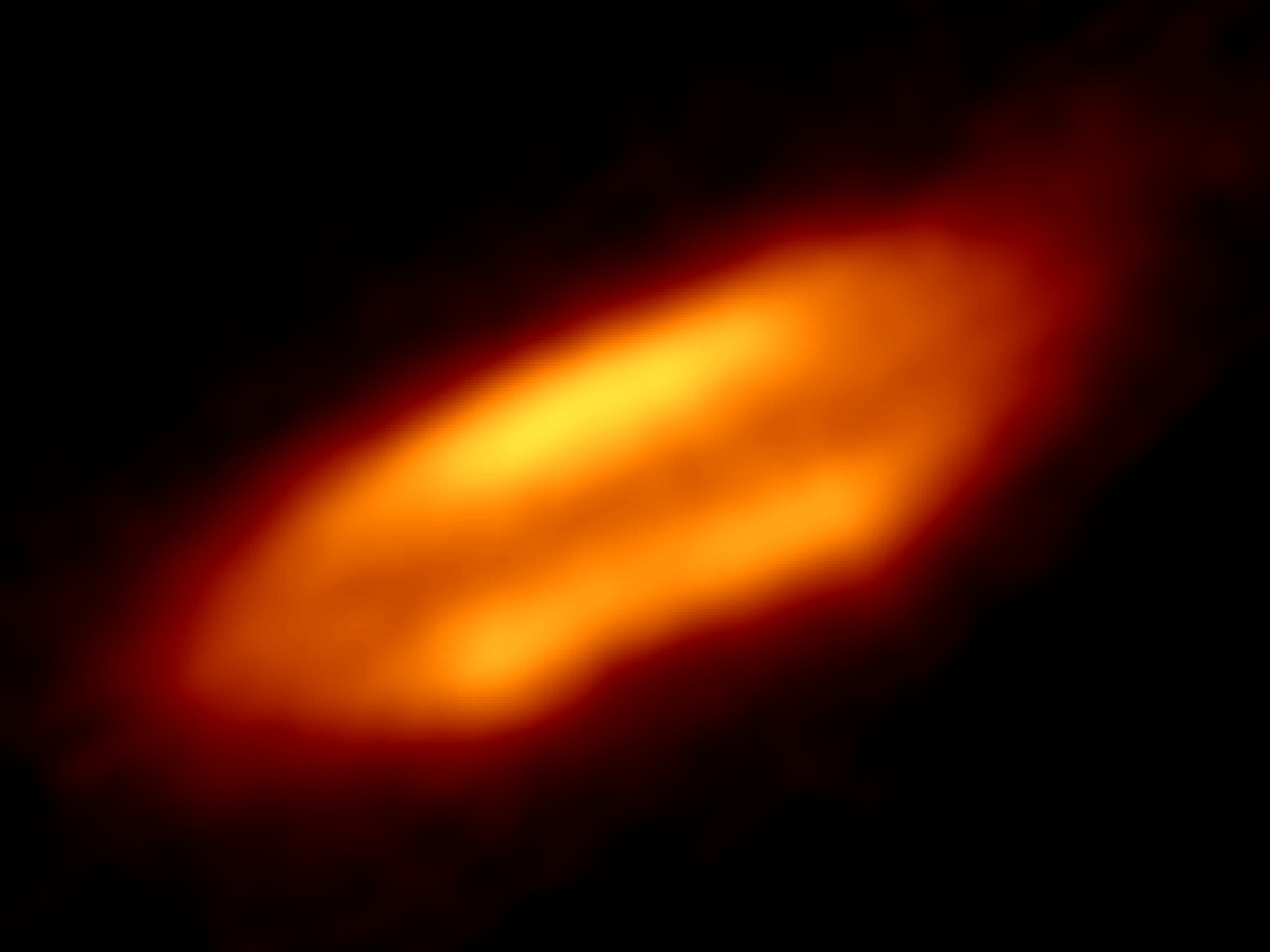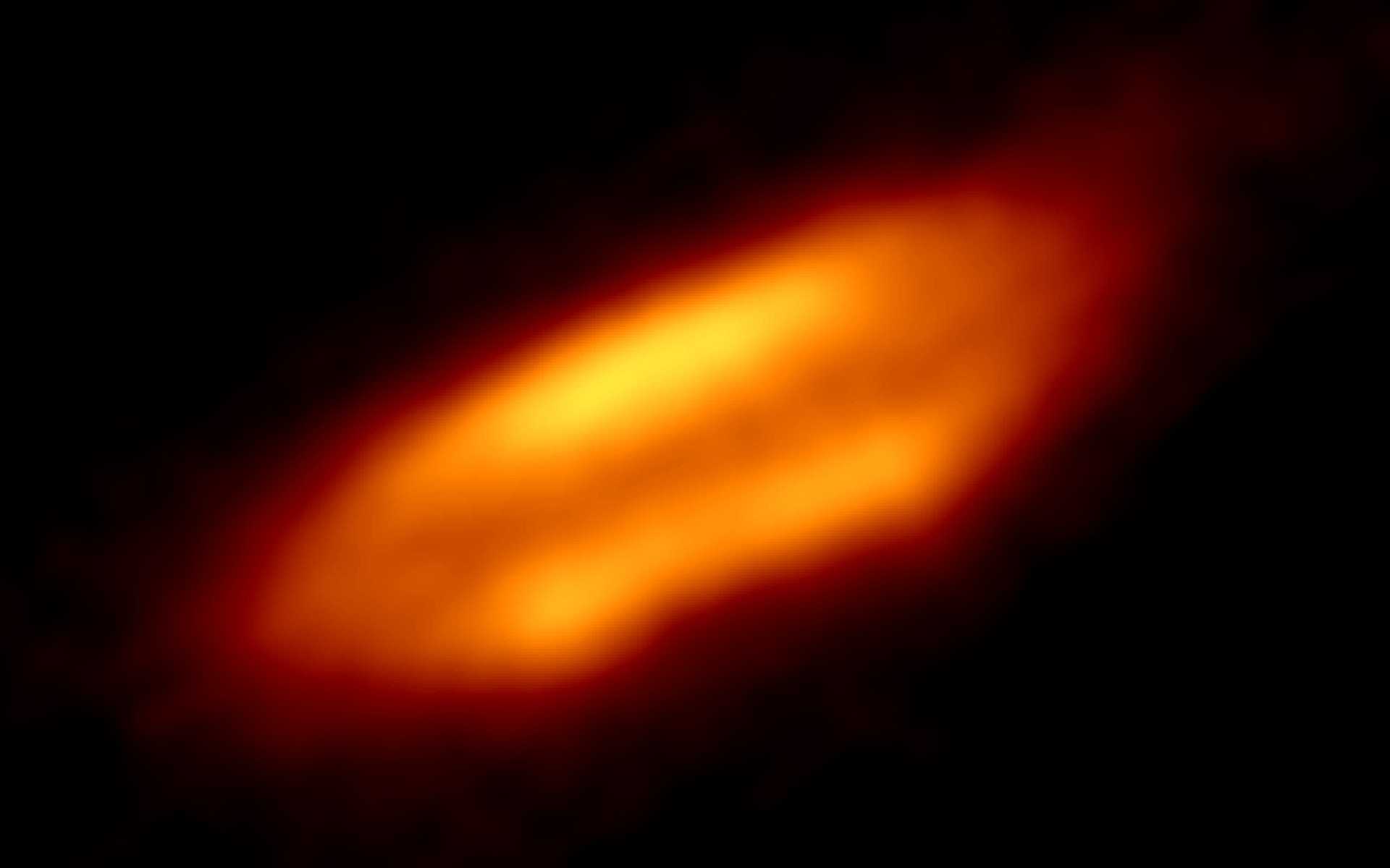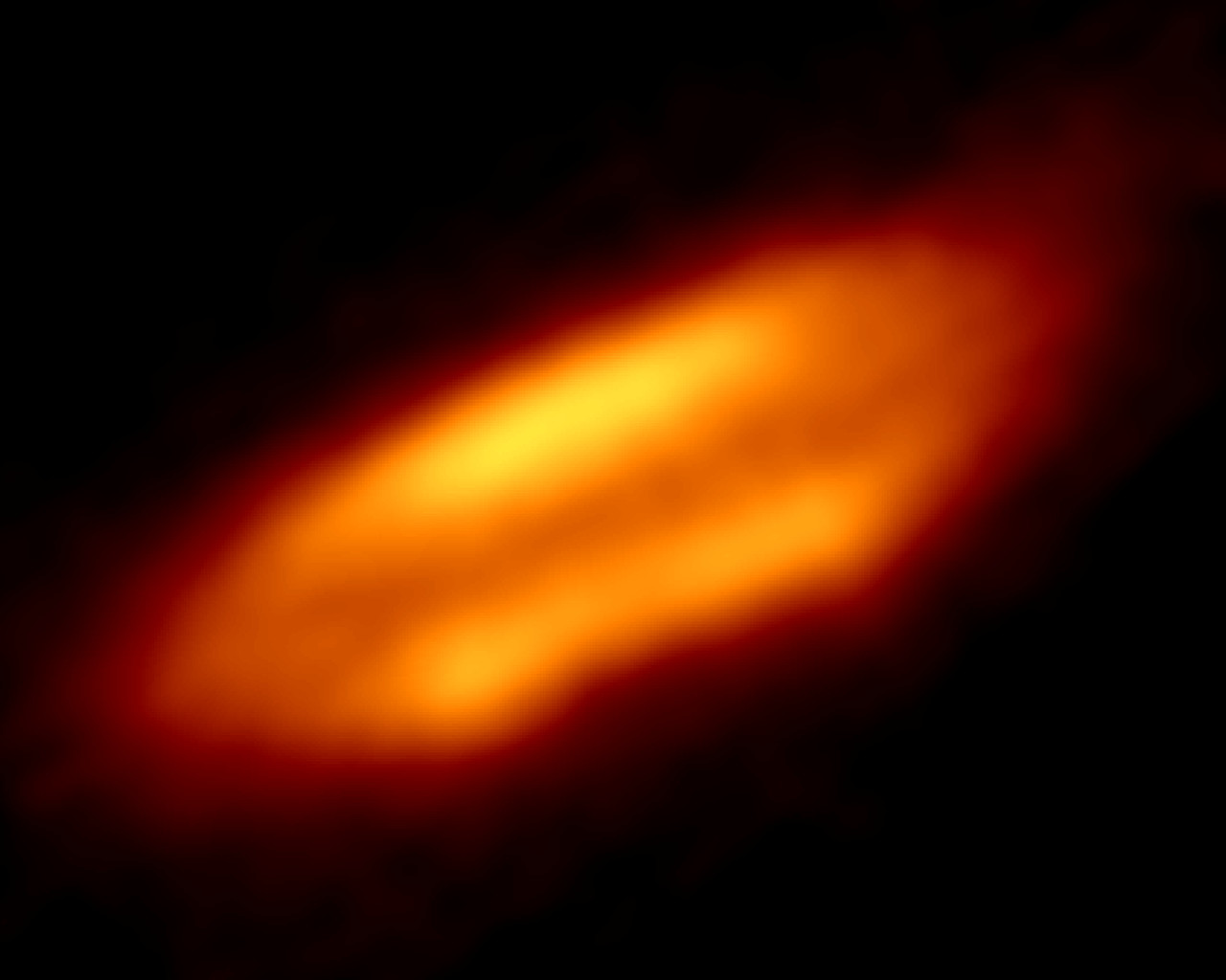 Un examen plus minutieux de HH 212 révèle une proéminente bande de poussière froide et obscure qui traverse le disque, prise en sandwich entre les deux régions plus brillantes qui sont chauffées par la proto-étoile. Le résultat ressemble à un “hamburger” cosmique. C’est la première fois que les astronomes ont pu déceler une telle bande de poussière dans les phases initiales de la formation stellaire et cela pourrait fournir des indications sur la naissance des systèmes planétaires.