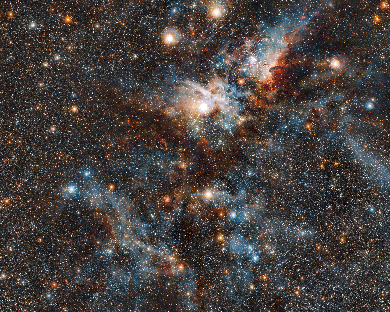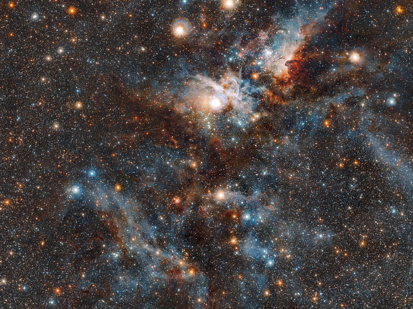 Questa spettacolare immagine della Nebulosa della Carena rivela come mai prima d'ora la nube dinamica di materia interstellare e di gas e polvere distesi in sottili strati.Le stelle massicce all'interno di questa bolla cosmica emettono radiazioni intense che fanno brillare il gas circostante.Al contrario, altre regioni della nebulosa contengono colonne scure di polvere che avvolgono le stelle appena nate.