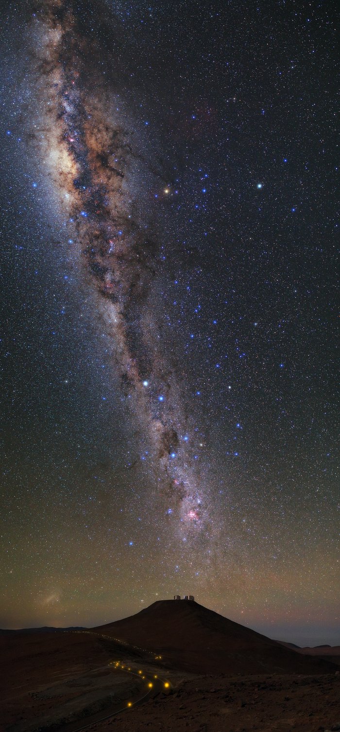 L’ubicazione del VLT è stata scelta molto accuratamente. È vitaleavere un sito il più secco possibile, poiché il vapore acqueo assorbe la radiazione infrarossa e fa deteriorare la qualità delle osservazioni. Per ridurre gli effetti dell’atmosfera terrestre il più possibile, il VLT si trova a 2600 metri sopra il livello del mare, per minimizzare la quantità di atmosfera che si trova tra noi e le stelle. Grazie a questa remota ubicazione, Paranal riesce ad essere praticamente indisturbato e senza inquinamento luminoso. Perfino la strada serpeggiante che porta all’osservatorio attraverso il deserto di Atacama è poco illuminata per evitare ogni inutile inquinamento luminoso in quest’immagine una striscia di stelle tagliail cielo notturno come del fumo che sale da un camino celeste. È la nostra galassia, la Via lattea. Verso la cima dell’immagine si può vedere una parte più brillante e più larga - è il "bulge" galattico pieno di stelle, che si trova nel cuore della Via Lattea.