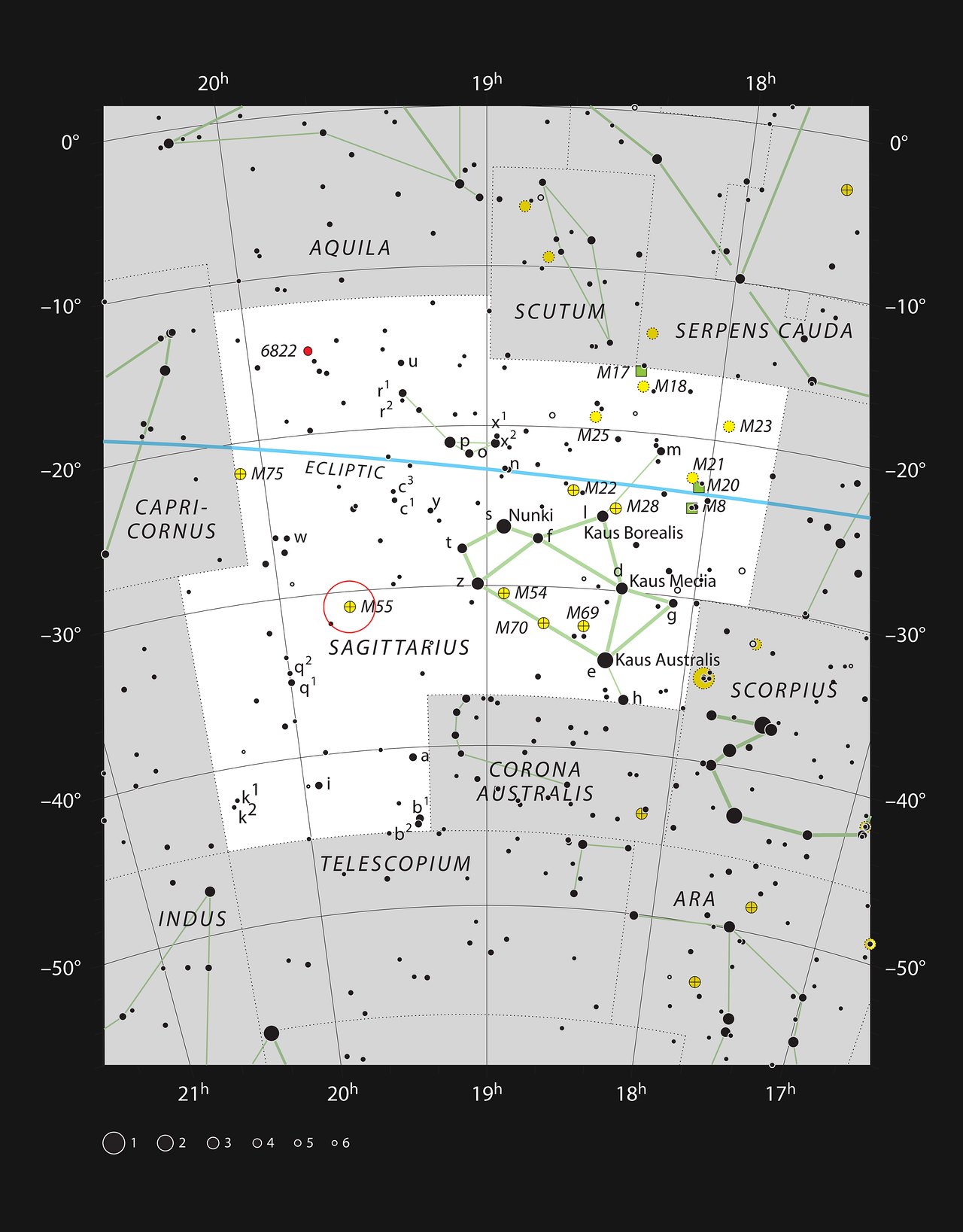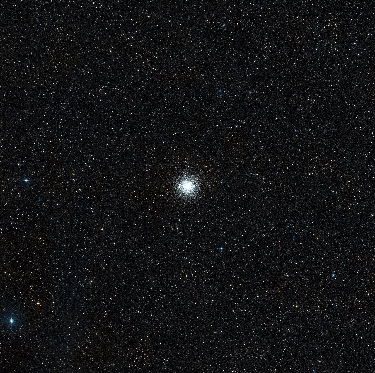 Gli ammassi globulari sono tenuti insieme, in una stretta formazione sferica, dalla forza di gravità. In Messier 55 le stelle si tengono certamente buona compagnia: circa centomila stelle sono racchiuse in una sfera con un diametro che corrisponde a solo circa 25 volte la distanza tra il Sole e il sistema stellare più vicino, Alfa Centauri.