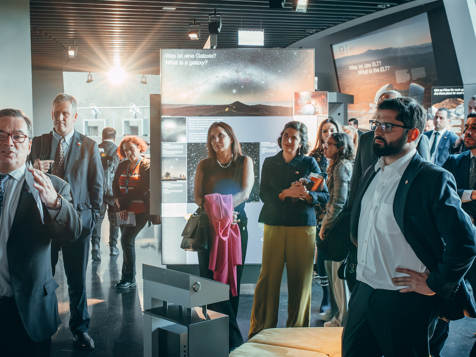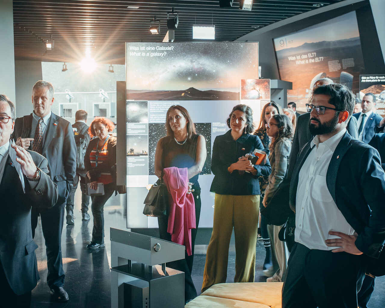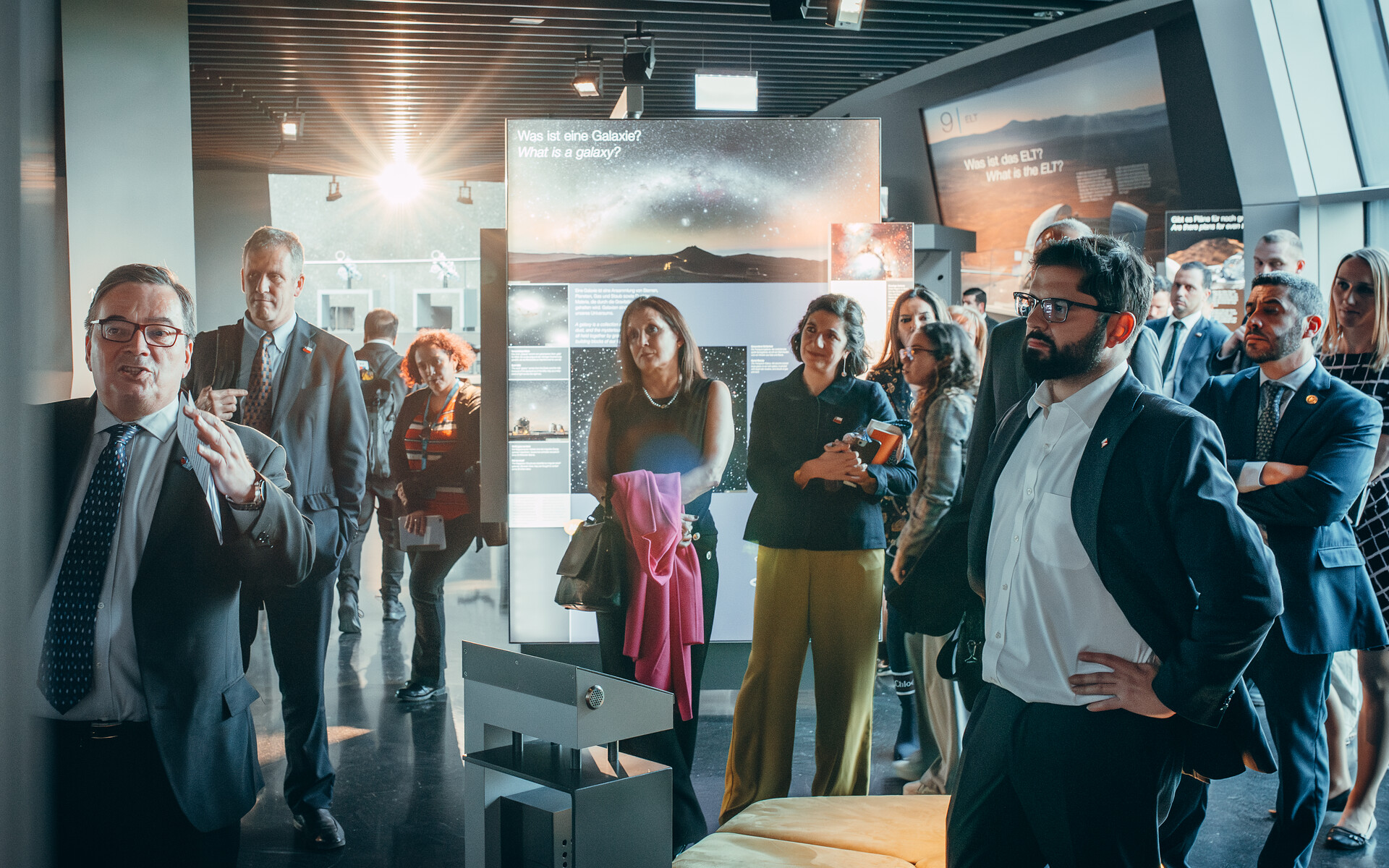Following the visit of Chilean President Gabriel Boric (forefront, right) on the 12 June 2024 to the ESO Headquarters, the delegation also had the opportunity to tour the ESO Supernova Planetarium & Visitor Centre. The delegation was met by ESO Director General Xavier Barcons (forefront, left).