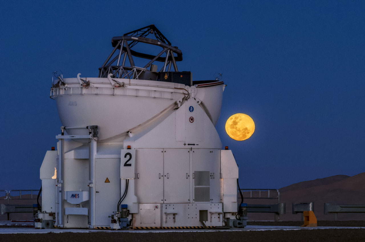 Almost like a sunflower, this Auxiliary Telescope at the Paranal Observatory opens its eye the moment the Moon is rising above the horizon.