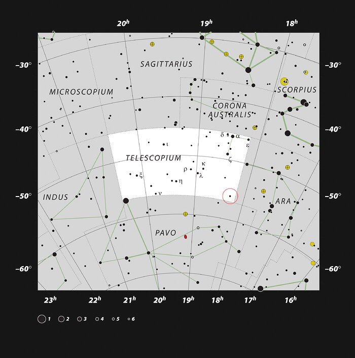 This chart shows the location of HR 6819 in the constellation of Telescopium. This map shows most of the stars visible to the unaided eye under good conditions and the system itself is marked with a red circle. The two stars in HR 6819 can be viewed from the southern hemisphere on a dark, clear night without binoculars or a telescope.
