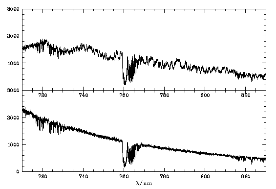 Extracted spectrum from a selected fibre (Argus LR773.4, @164). Top: without flat-field correction; bottom: with flat-field correction