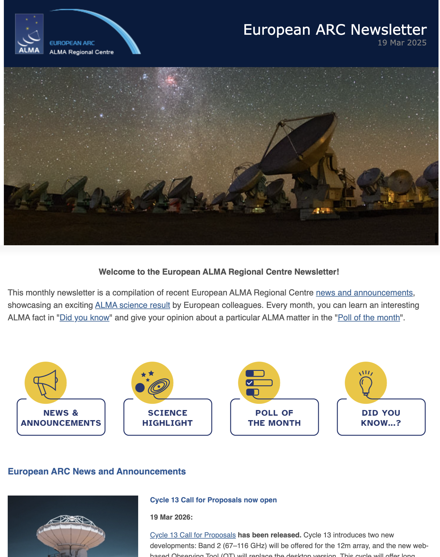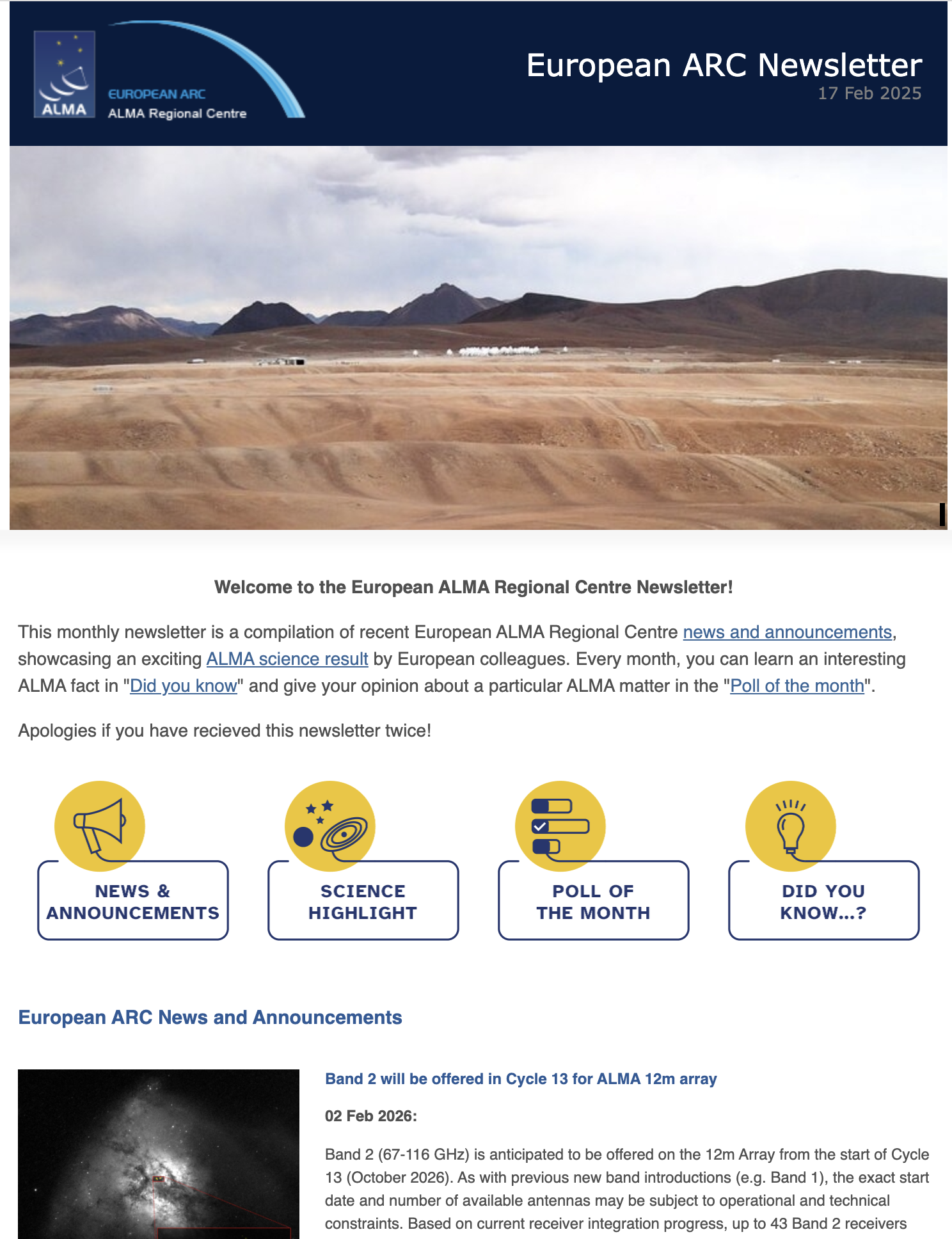 This Newsletter is a compilation of recent European ALMA Regional Centre Announcement items. Follow the links or visit the European ARC Announcements to read more. In addition to these Announcements the Newsletter informs you about various developments in the ALMA Programme, as well as about ALMA or ALMA-related meetings.