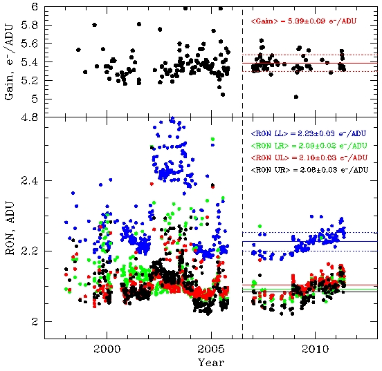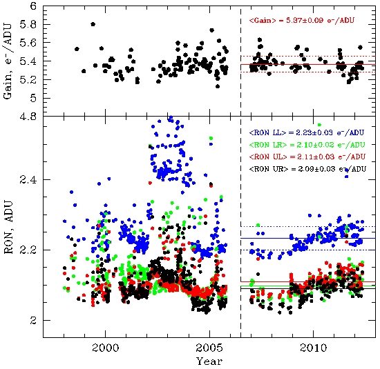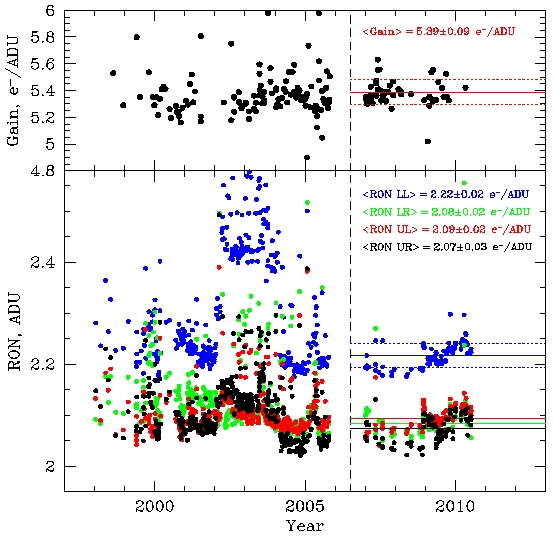 Same as above, except the solid lines are fits for the data after mid-2006 (marked with a vertical dashed line), and the dotted lines show the +/-1-sigma deviations (only some are shown on the bottom panel for clarity). The gain is stable. The tendency for increasing readout noise that was seen a year ago may be flattening.