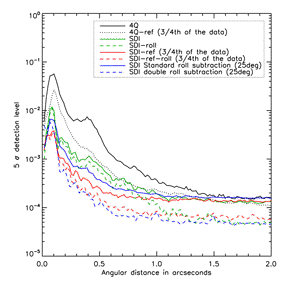 Another technique, which is called double roll subtraction, has been tested (dashed blue).It consists in using only SDI data of the star and subtracting the SDI star data to themselves but with different angular separations. For example, we calculate the images that have a separation of25° :SDI(0°) - SDI(25°) and SDI(5°) - SDI(30°)and SDI(10°) - SDI(35°), etc up to SDI(25°) - SDI(50°).