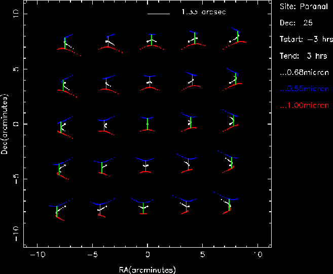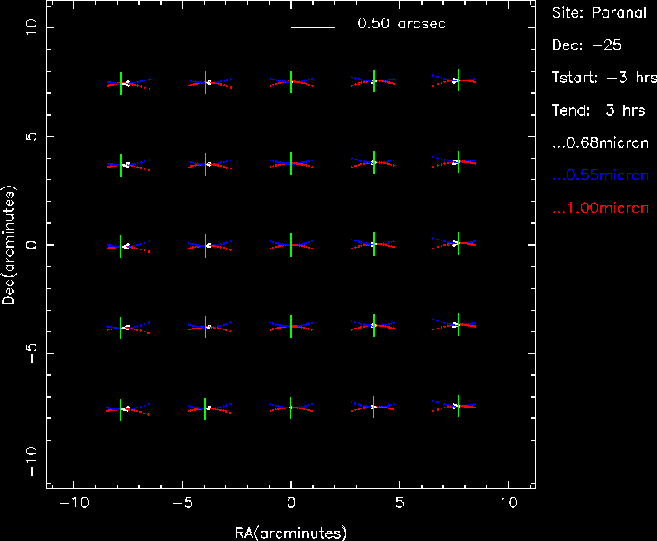 The following figures illustrate the atmospheric effects, including field differential refraction and chromatic dispersion, in the VIMOS field of view, at different field declinations, in the red and blue spectral domains, from -3 hrs before meridian to +3 hrs after meridian. This illustrates the importance of carefully choosing the slit orientation versus the time of the observations. The green lines indicate the direction and position of the slits, aligned N-S for the illustration. Note the varying scale from figure to figure. Much of this material is further explained in Cuby, Bottini and Picat, 1998, SPIE 3355, 36-47 .