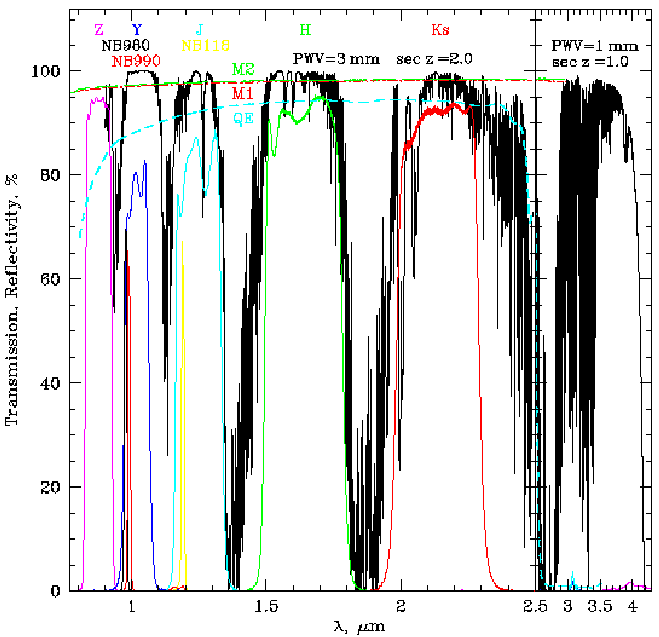 The list of available filters is given in the table below, followed by a plot with the filter transmission curves, the detector quantum efficiency curves, and a theoretical model for the atmospheric transmission for various airmasses and water vapor content of the atmosphere.