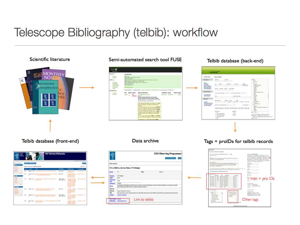 Fig. 1: FUSE and telbib connect published literature and data located in the ESO Science Archive, keeping track of the observing facilities and programs used for the research.
