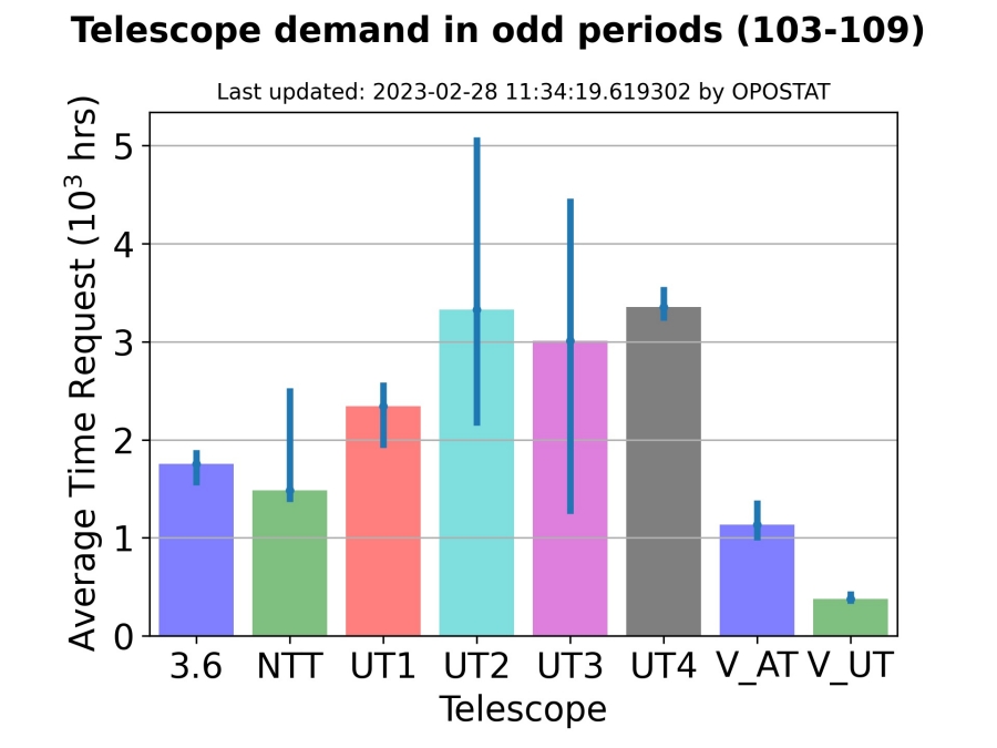 Figure 1: Average telescope time request over the past four relevant semesters (odd or even, depending on the current period). The vertical errorbars indicate the peak-to-peak ranges for each telescope. Units on the y-axis are thousands of hours. The large variation seen in UT2 and UT3 is mostly related to the move of X-Shooter from UT2 to UT3 in P105. The times included in the plot correspond to the runs requested in the given semester by proposals submitted in the same semester.