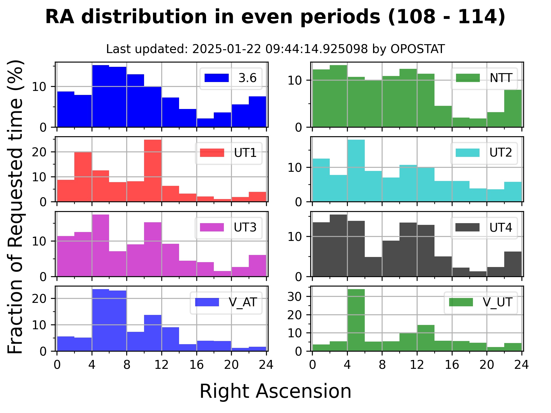 Figure 2: Prediction of the demand according to the RA distribution during the current period based on requests from the corresponding periods over the last four relevant semesters (odd or even). For each telescope this is calculated as (100*TimeRA)/(TimeTotal). Note that requesting time for targets with visibility outside the current period can drastically reduce the chances of the run being scheduled.