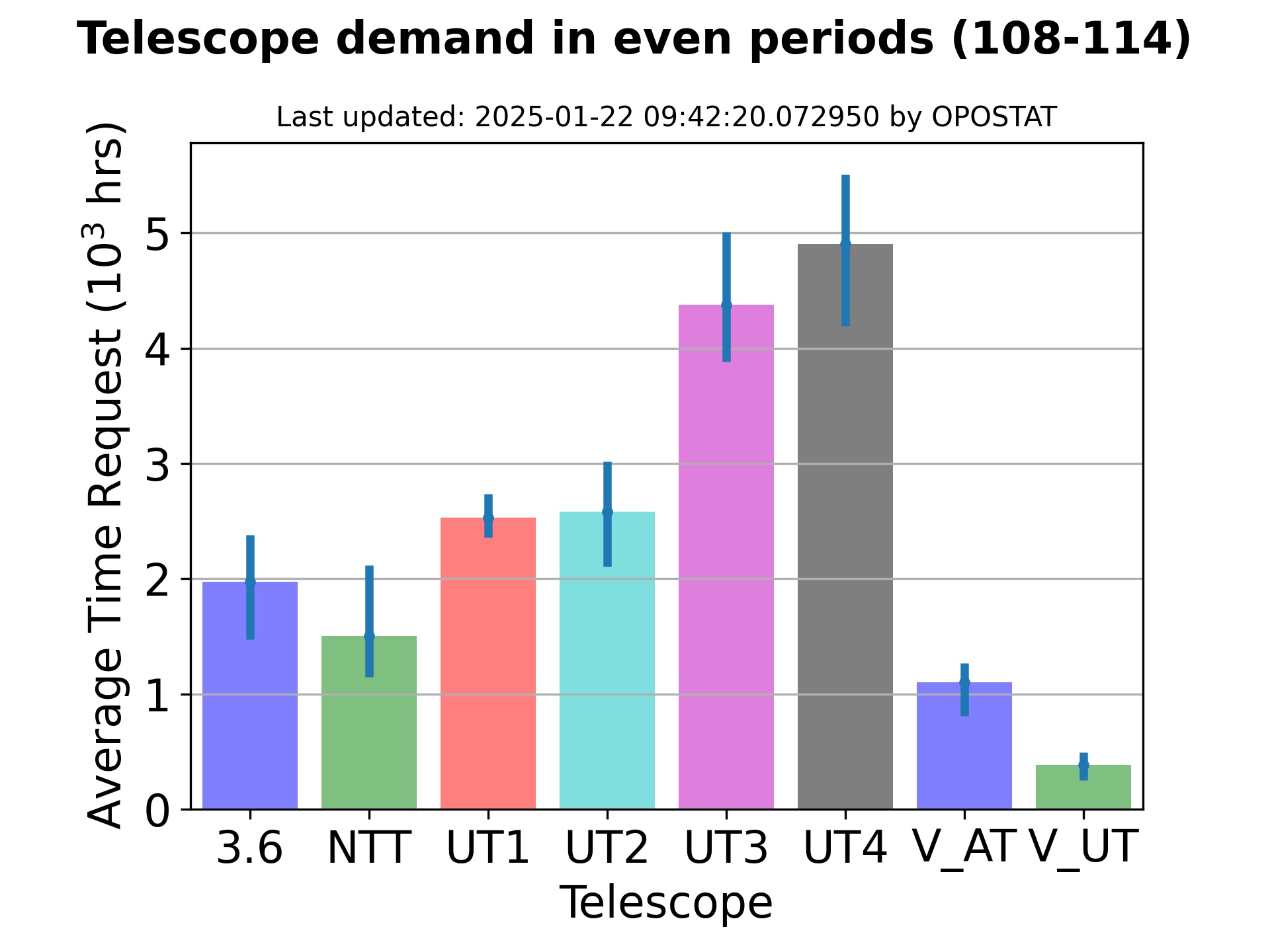 Figure 1: Average telescope time request over the past four relevant semesters (odd or even, depending on the current period). The vertical errorbars indicate the peak-to-peak ranges for each telescope. Units on the y-axis are thousands of hours. The times included in the plot correspond to the runs requested in the given semester by proposals submitted in the same semester.