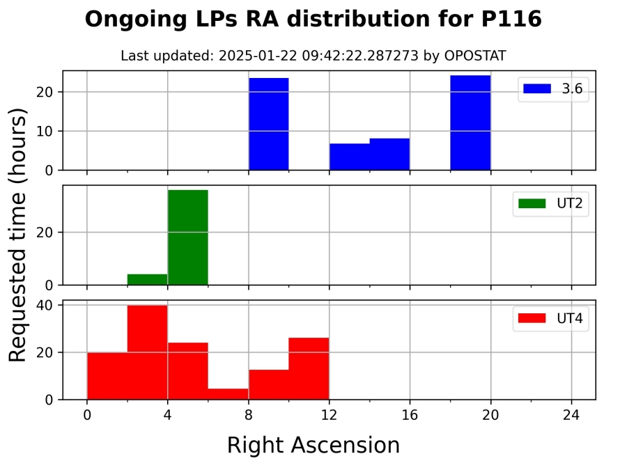 The distribution of the demand in Right Ascension (RA) is far from uniform throughout the year (see Figs. 1 and 2), and the probability that an OPC recommended run is successfully scheduled and completed depends on this pressure. Proposers are encouraged to read the article by Alves & Lombardi (2004, The ESO Messenger, 115, 15) on the sky distribution of VLT observations. In order to optimize the chances of time allocation, and to maximize the scientific return of the Observatory, proposers should be aware that choosing targets at certain RAs can have an enormous impact on the probability of successful scheduling and completion of their runs.