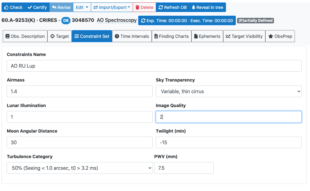 By clicking on to the Constraint Set tab you access the corresponding section, where you will have to provide constraint on airmass, Sky Transparency (i.e., Photometric, Clear, Variable thin cirrus, Variable thick cirrus, the latter not selectable for AO-mode), Lunar Illumination, Image Quality (to be set to 2 for AO observation), Moon Angular Distance, Twilight (min), Turbulence Category and Precipitable Water Vapor (mm).