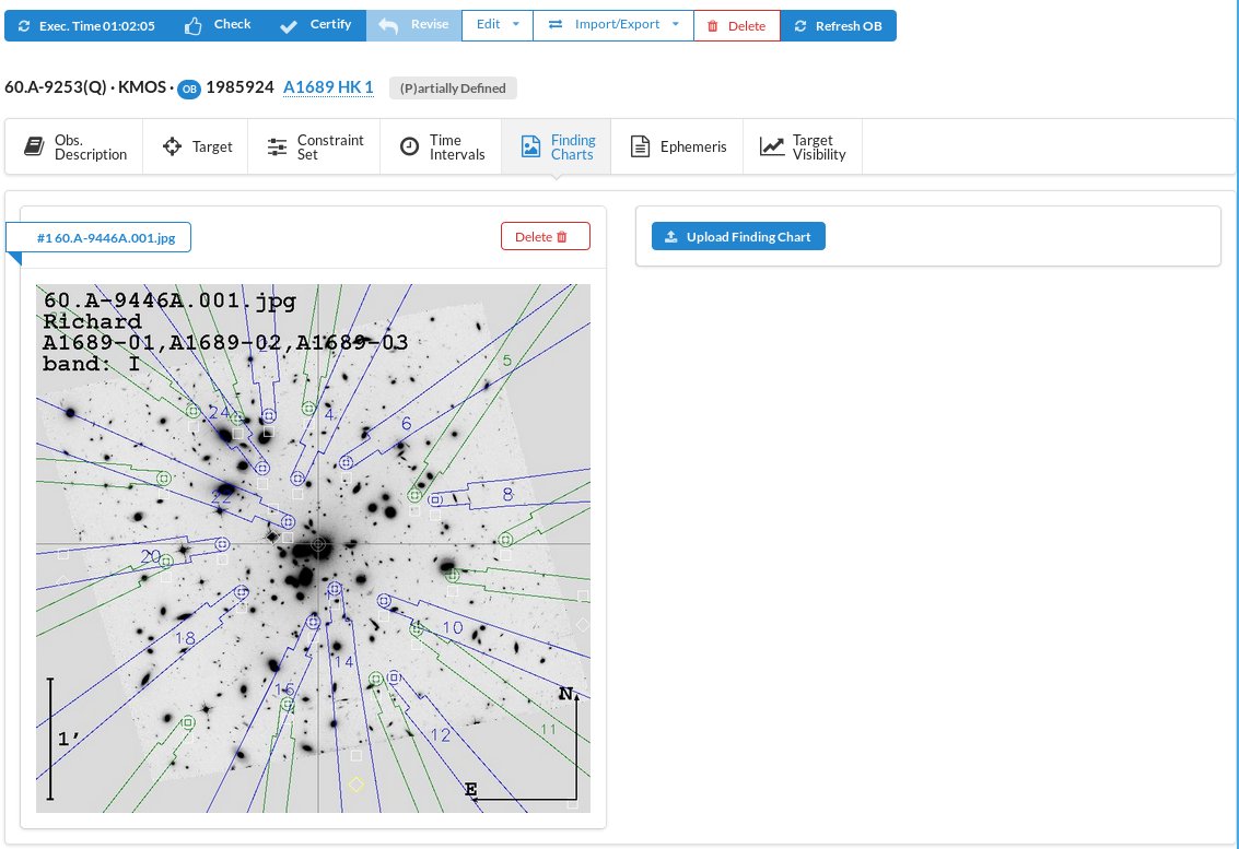Wait! The OB is not entirely complete yet. We have not attached any Finding Charts to the OB yet. Following the general rules and KMOS-specific rules for Finding Chart generation, you make your Finding Chart(s). The jpg file(s) should then be on your local disk, and you attach them to the OB by clicking on the Finding Charts item on the top OB menu, and pressing the blue Upload Finding Chart button. This gives you a browser window, in which you navigate to the correct directory and select the file(s). After the upload your OB window shows a small version of your finding chart, like this one in our case: