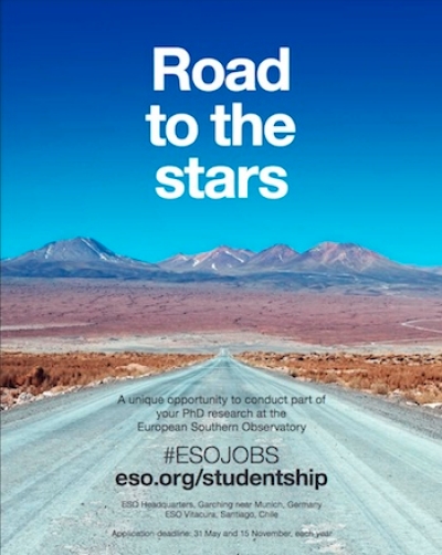The ESO research studentship programme provides an outstanding opportunity for PhD students to experience the exciting scientific environment at one of the world's leading observatories. ESO's studentship positions are open to students enrolled in a university PhD programme in astronomy or related fields. Students accepted into the programme work on their doctoral project under the formal supervision of their home university, but they come to ESO to work and study under the co-supervision of an ESO staff astronomer for a period of between one and two years.