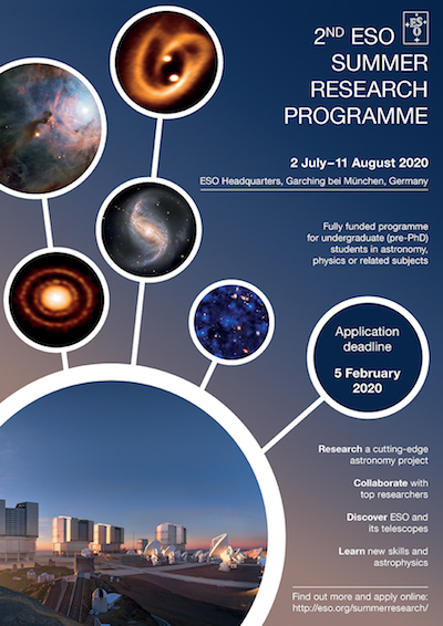 The very successful ESO Summer Research Programme will continue in 2020. This fully-funded programme provides a unique opportunity to students who are not yet enrolled in PhD programmes to carry out a six-week long research project at the ESO Headquarters in Garching. The students will be able to choose between a wide range of research projects, covering many areas of astronomy from exo-planets to cosmology. The ESO Summer Research Programme will also provide opportunities beyond research, including lectures, a mini-workshop, and many social activities.