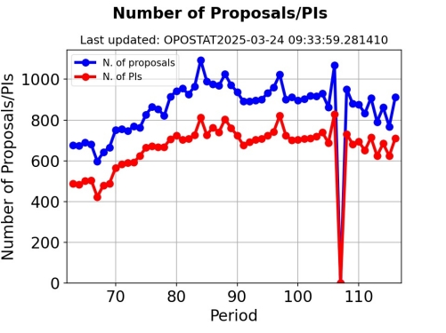 ESO received 913 valid proposals for observations in Period 116 (1 October 2025 - 30 April 2026, with a duration of 7 months). The deadline for proposal submission was 20 March 2025. On the VLT, the most demanded ESO instrument was MUSE with a request of 3034.5 hours (i.e. 379.3 nights of an average duration of 8 hours), followed by ESPRESSO with 2594.8 hours, and XSHOOTER with 2221.2 hours. HARPS/NIRPS on the ESO 3.6-metre telescope was the most demanded instrument at La Silla, with a combined request of 3277 hours. The plot above shows the number pf ESO Proposals/PIs since Period 62. The fluctuations in the recent years are due to Large Programmes being offered only in even periods since P106. The peak in P106 is due to the extension of the proposal submission deadline during the pandemic.