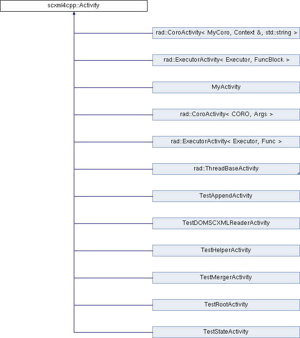 Implemented in rad::ExecutorActivity< Executor, Func >, rad::ExecutorActivity< Executor, FuncBlock >, rad::CoroActivity< CORO, Args >, rad::CoroActivity< MyCoro, Context &, std::string >, rad::ThreadBaseActivity, TestRootActivity, TestDOMSCXMLReaderActivity, TestAppendActivity, TestStateActivity, TestMergerActivity, TestHelperActivity, and MyActivity.