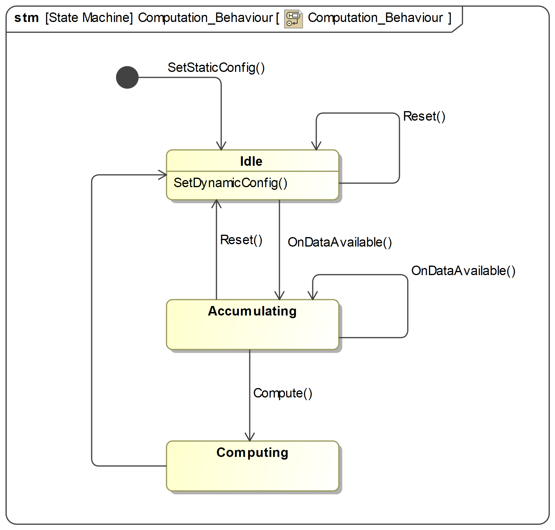 The figure below shows the protocol state machine of the Computation class used in the exampleDataTask. The state machine shows the possible API method invocation sequences and the resulting accumulation and computation cycles in a very simplistic way.