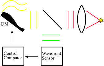 The aperture size of an optical system puts a limit on the achievable angular resolution. This limit can only be reached if the light wave is not aberrated. For astronomical observations from the ground the light from space has to travel through earth's atmosphere, and will be diffracted at cells of warm and cold air which are mixed by atmospheric turbulence. As a result, the wavefront is aberrated on timescales of tens of milliseconds which is approximately set by the wind speed and the strength of the turbulence. A long exposed image will be blurred and not sharper than that obtained with a small amateur telescope (at least at visible wavelengths).