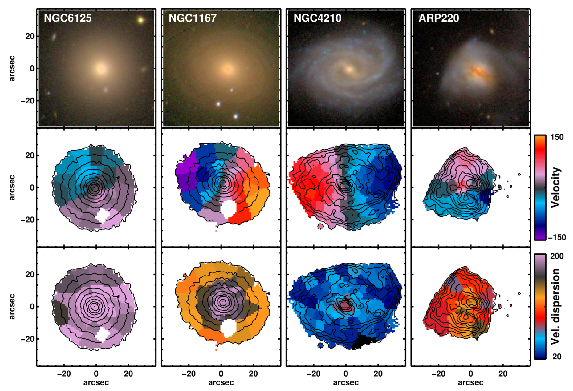 Examples of line-of-sight stellar kinematic maps from the CALIFA survey (Falcón-Barroso, Lyubenova, van de Ven et al. 2017).