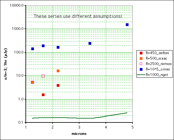 The NGST NIR-SPEC at R=1,000 is taken from the Yardstick ETC for point sources which assumes a detector dark current of 0.02e- s-1 (ie. this is a hypothetical instrument: the VLT measurements and calculations include a good measure of current reality!). The VLT calculations generally assume the dark current to be 0.1 which has a significant effect on the high R CRIRES prediction. The VLT instruments with R ranging up to a few thousand make different assumptions about image quality but the ISAAC figures do not include AO and are measured under typical observing conditions with seeing ~ 0".6. For R greater than about two to three thousand, it is possible to see a substantial fraction of the shorter wavelength NIR spectrum between the OH lines where the sky is very dark. A groundbased instrument with a dark current of around 0.1e- s-1becomes detector noise limited at R~3,000 between the OH lines when looking more than about 30 degrees from the bright Moon. The figures for the SINFONI instrument appear better than ISAAC at R=500 because it observes at a higher R between the OH and does software binning of the data back to low resolution. At its higher resolutions, ISAAC is able to operate in a similar fashion. The differences between space and groundbased sensitivity below about 2.5 micron then depends primarily on the ability to exploit the diffraction limit of the telescope.